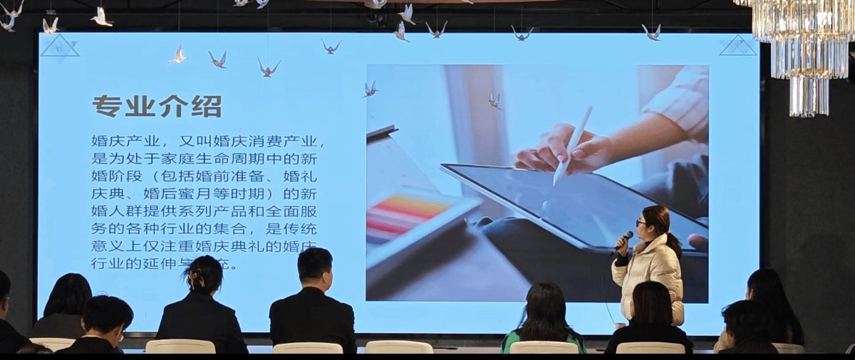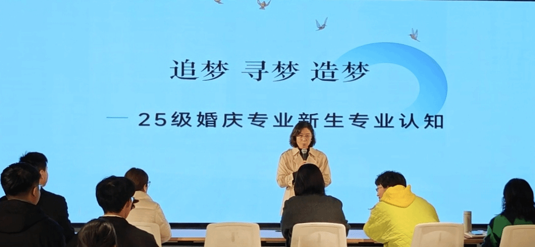 婚庆服务与管理专业教研室主任李文娟以“追梦、寻梦、造梦”为主题,围绕专业设置、培养目标、课程体系及就业方向等内容,为新生进行了系统而全面的专业介绍,帮助同学们初步建立起对婚庆服务与管理专业的整体认知,增强了专业认同感。教研室老师史芳明、石艳春、林静、许莹、李文静、陈昱欣等专业课教师依次上台,结合各自所授课程,生动讲解了课程内容、学习方法及实践应用,激发了同学们对后续专业学习的浓厚兴趣。活动还特别设置了“投许愿球”环节。同学们在彩纸上认真书写下自己对大学生活的美好愿景与职业梦想,亲手将一个个承载着梦想和希望的许愿球郑重地投入许愿箱,寓意着对未来的承诺与期许。
