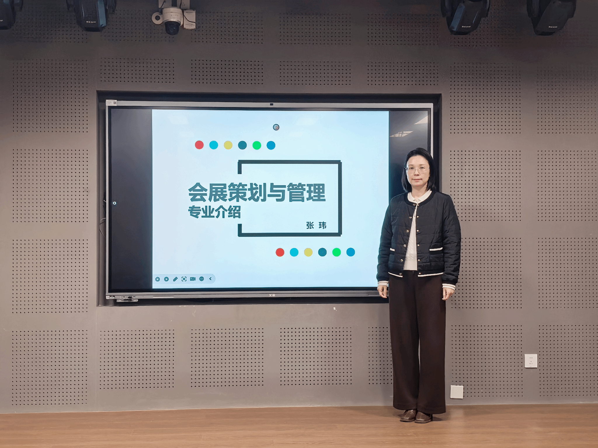 会展策划与管理专业教研室主任张玮围绕会展专业概述、课程体系与学习目标、专业活动与实习实训、未来发展空间、升学与就业方向展开,既清晰界定了会展涵盖内容,又明确了“基础课+核心课+拓展课”的课程框架,展示了实训室建设、校内活动策划、校外见习等实践成果,同时梳理了会展策划师、现场管理专员等岗位的就业路径以及未来专升本的成长方向。