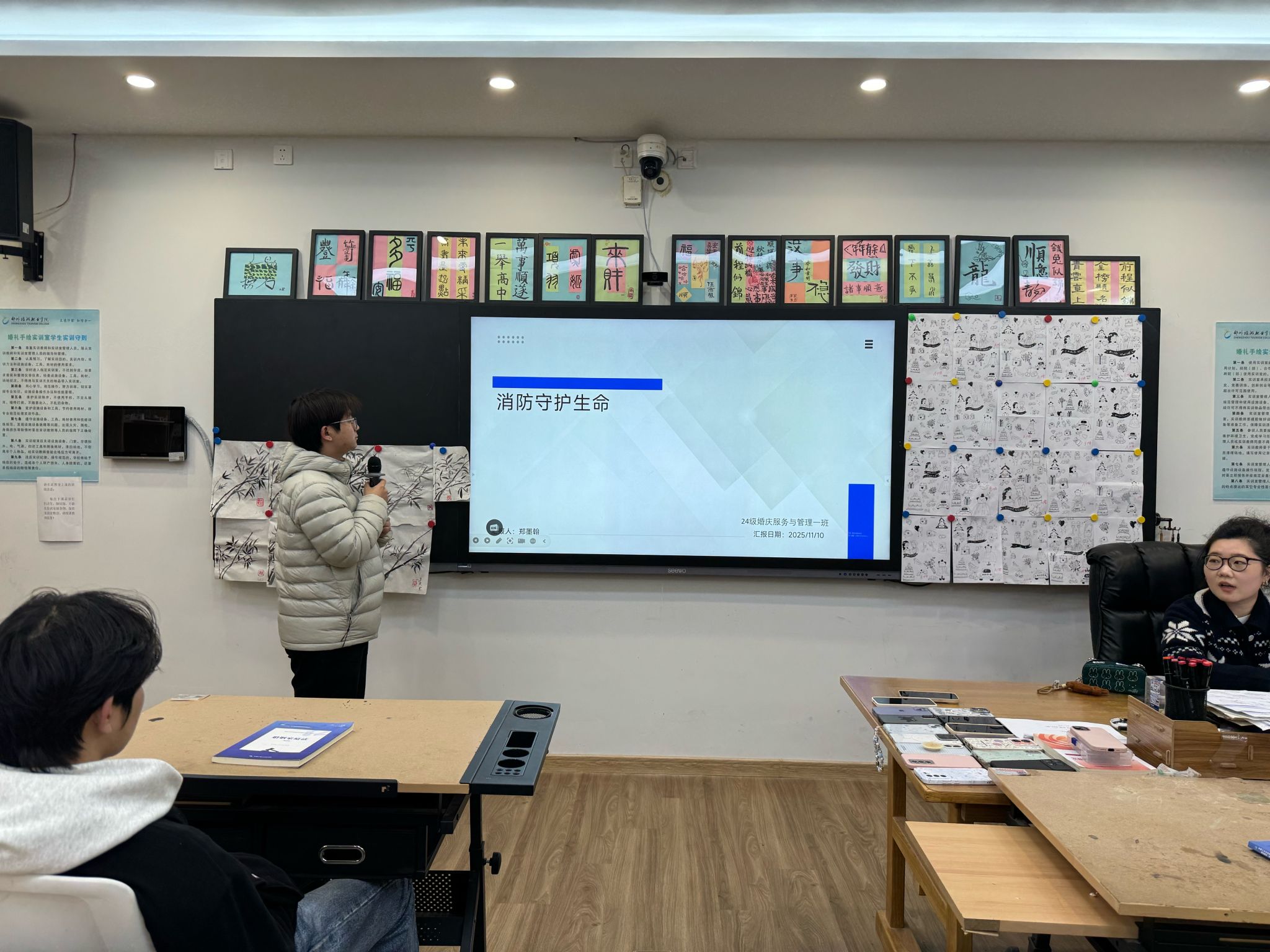 为深入贯彻消防安全教育要求,切实增强学生消防安全意识,普及用火用电安全知识,提升应急自救与互救能力,筑牢校园安全防护网。智慧服务学院于11月10日在1A教学楼开展“全民消防、生命至上——安全用火用电”主题班会。