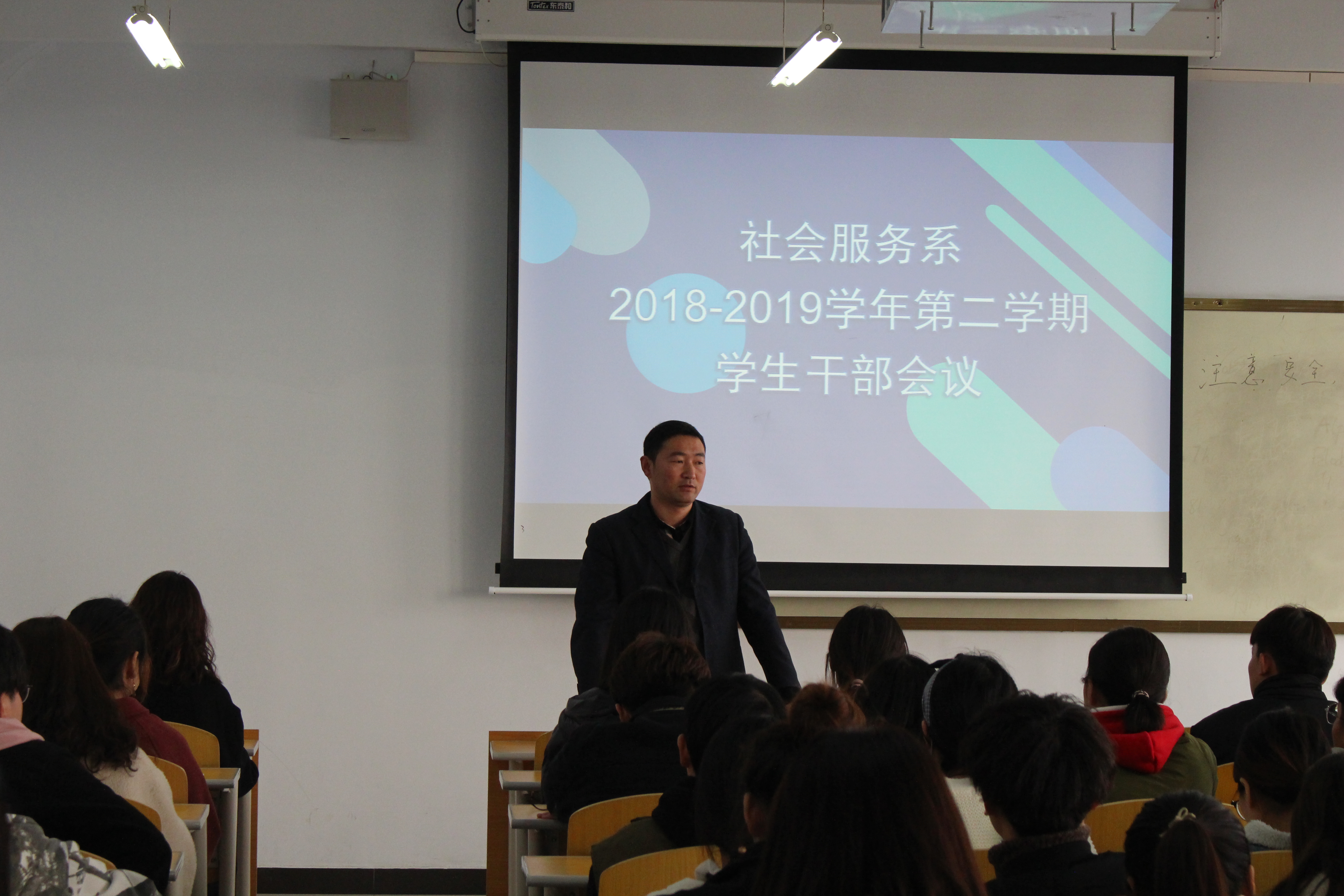 寒假的脚步渐行渐远,我们迎来了新的学期,社会服务系于2019年2月24日在1号教学楼507教室举行了“2018—2019学年第二学期学生干部会议”。出席本次会议的有系主任李俊、副主任刘兆坤、团总支书记段会利以及社会服务系全体学生干部。