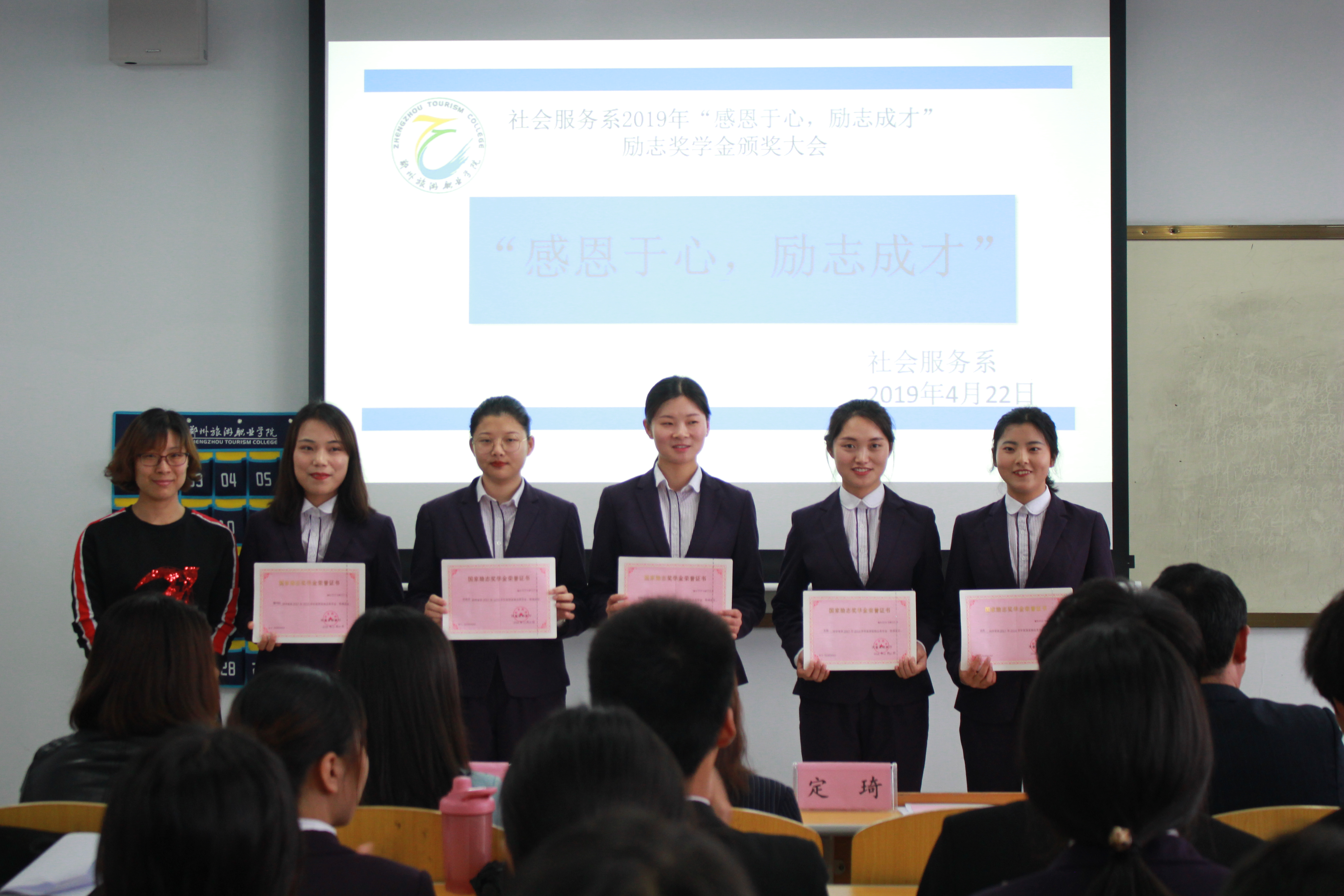 为了构建社会主义核心价值体系,培育一种尊重奉献、褒扬崇高的价值追求。社会服务系于2019年4月22日在1号教学楼507教室举行了“感恩于心,励志成才”为主题的国家励志奖学金颁奖大会。参与本次会议的有我系副主任定琦、副主任刘兆坤、团总支书记段会利、各辅导员老师、学生干部及17级国家励志奖学金获得者。