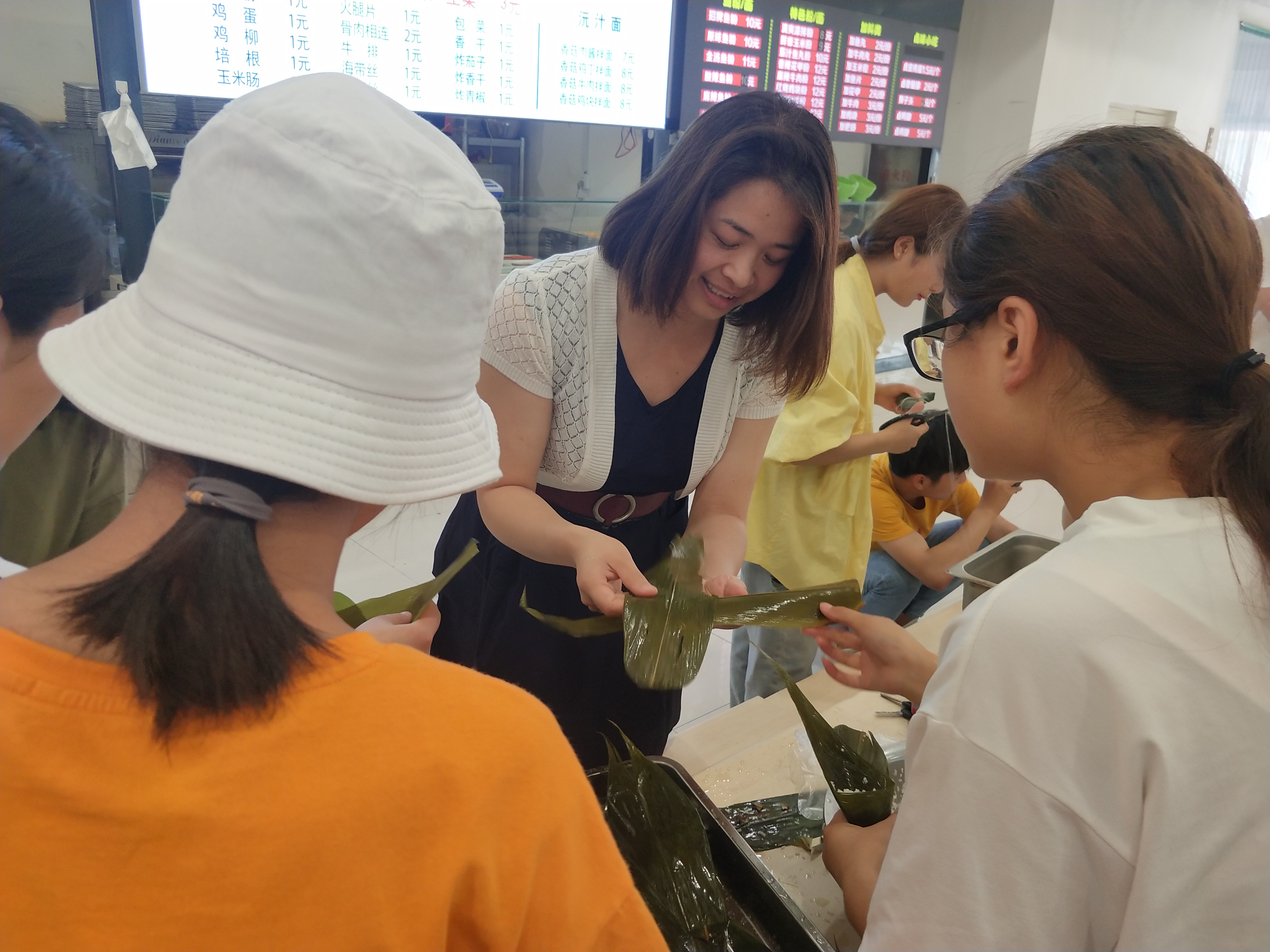 活动现场,同学们以事先安排好的名单,分配到各自包粽子体验桌。桌上已预先准备了米、粽叶、蜜饯等包粽子的材料。参与活动的同学们积极性很高,一到现场就迫不及待地戴上手套,围绕在桌子周围准备开始包粽子。由于同学们大多没有包粽子的经历,就请来了餐厅阿姨传授包粽子的技巧,场面甚是温馨。在阿姨的指导下,大家慢慢找到了窍门,动作娴熟了很多。。段会利老师、石帅老师、石艳春老师、赵爽老师也赶到现场,起初大家以为领导来视察的,没想到,老师们也加入到学生群中,主动担当起学生的业务指导,卷叶、裹米、包扎,一个造型可爱的粽子,就活脱脱的呈现出来,并且老师们还拿来了西瓜,招呼学生们一起吃。经过我们三个小时的努力,一桶桶大大小小、形状各异的粽子被送到了蒸笼里。