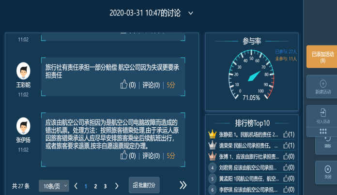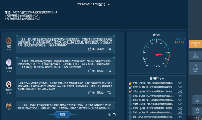 在民航地勤服务课程的网上教学过程中,我密切关注学生的学习实效,努力在直播的场景下,做好实时互动,及时采集数据,快速实时进行反馈,确保成效,真正做到网络授课与学校授课同等质量、同等效果。在直播授课的过程中,以25分钟一部分教师讲授为时间节点,每次都会将讲过的这部分知识点用互动的形式让学生进行复习与理解,通常采用讨论、头脑风暴、提问等形式。比如会针对某一个或几个问题,让学生进行讨论后回答,利用不定时抽查学生听课笔记或课堂实时摇号连麦提问的方法,“刺激”和“提醒”学生,将学生注意力始终保持在课堂上,并达到根据学生答案反馈适时调整授课进度与模式的目的。