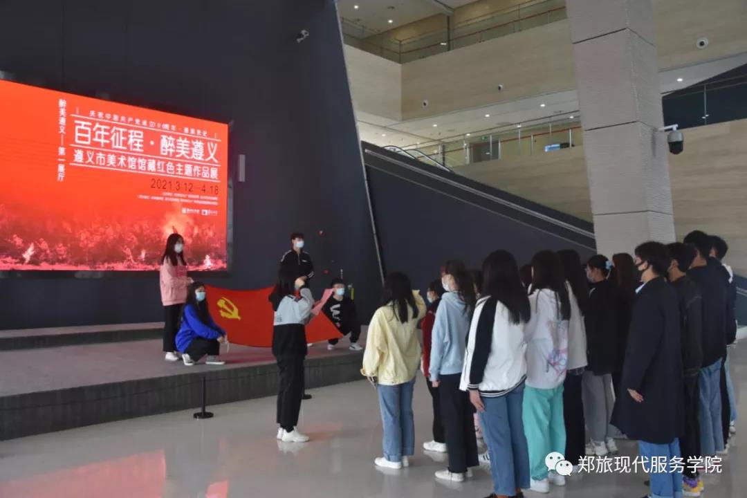 为庆祝中国共产党成立100周年,响应学校要求,现代服务学院开展深入学习党的历史,向革命先烈致敬的系列活动。4月7日下午,现代服务学院学生党支部书记段会利组织学生支部教师党员及33名青马工程培训班学员共赴郑州美术馆,参观学习“百年征程·醉美遵义——遵义市美术馆馆藏红色主题作品展”。