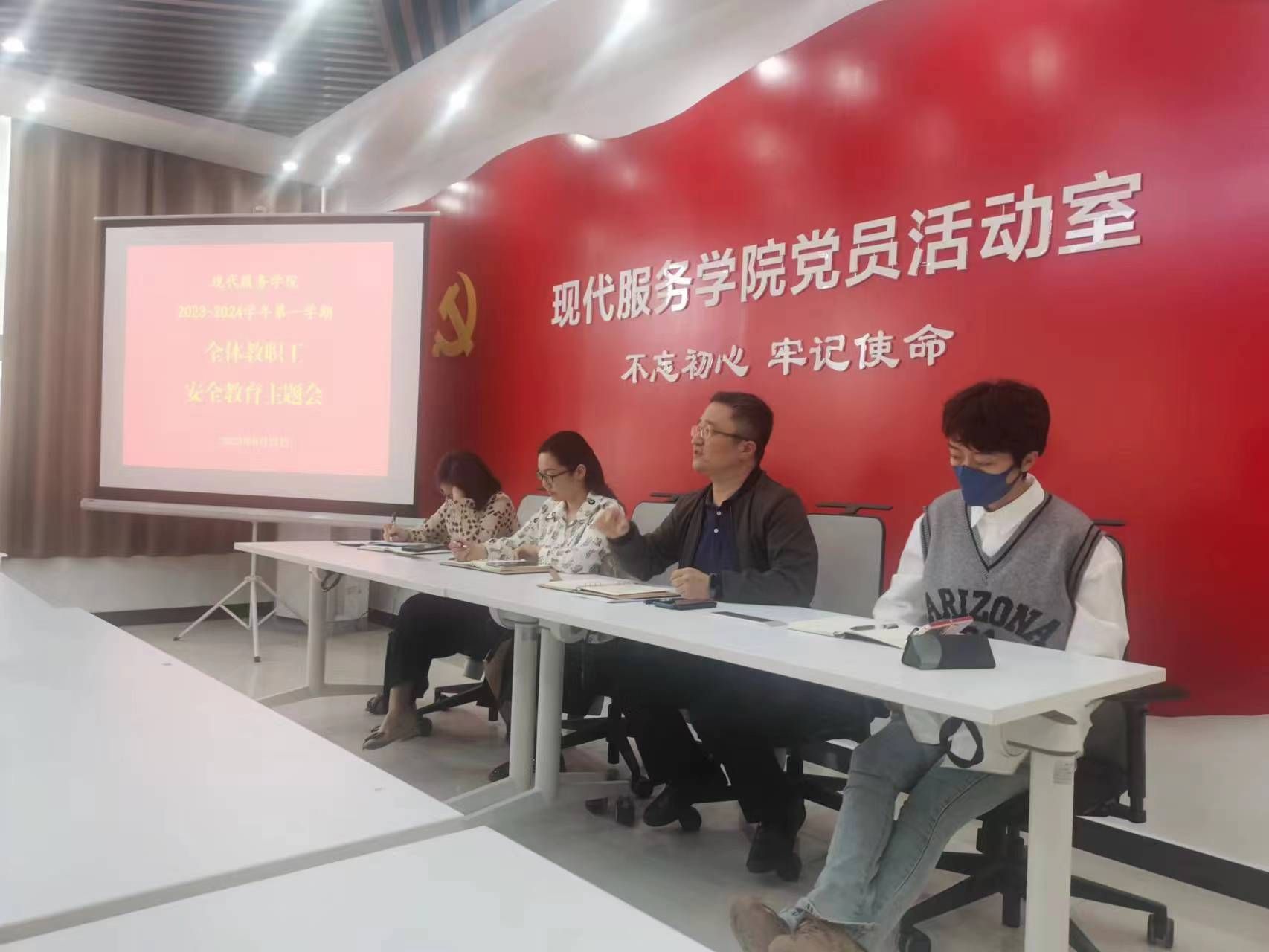 为深入开展学习贯彻习近平新时代中国特色社会主义思想主题教育,落实市委、市教育局党组工作要求,结合学院实际,现代服务学院全体教工于9月27日下午在1A208开展全体教职工大会,现代服务学院党总支书记郭防、院长许向蒲、副书记岳正阳、副院长定琦出席会议,会议由许向蒲主持,全体教职工参加。