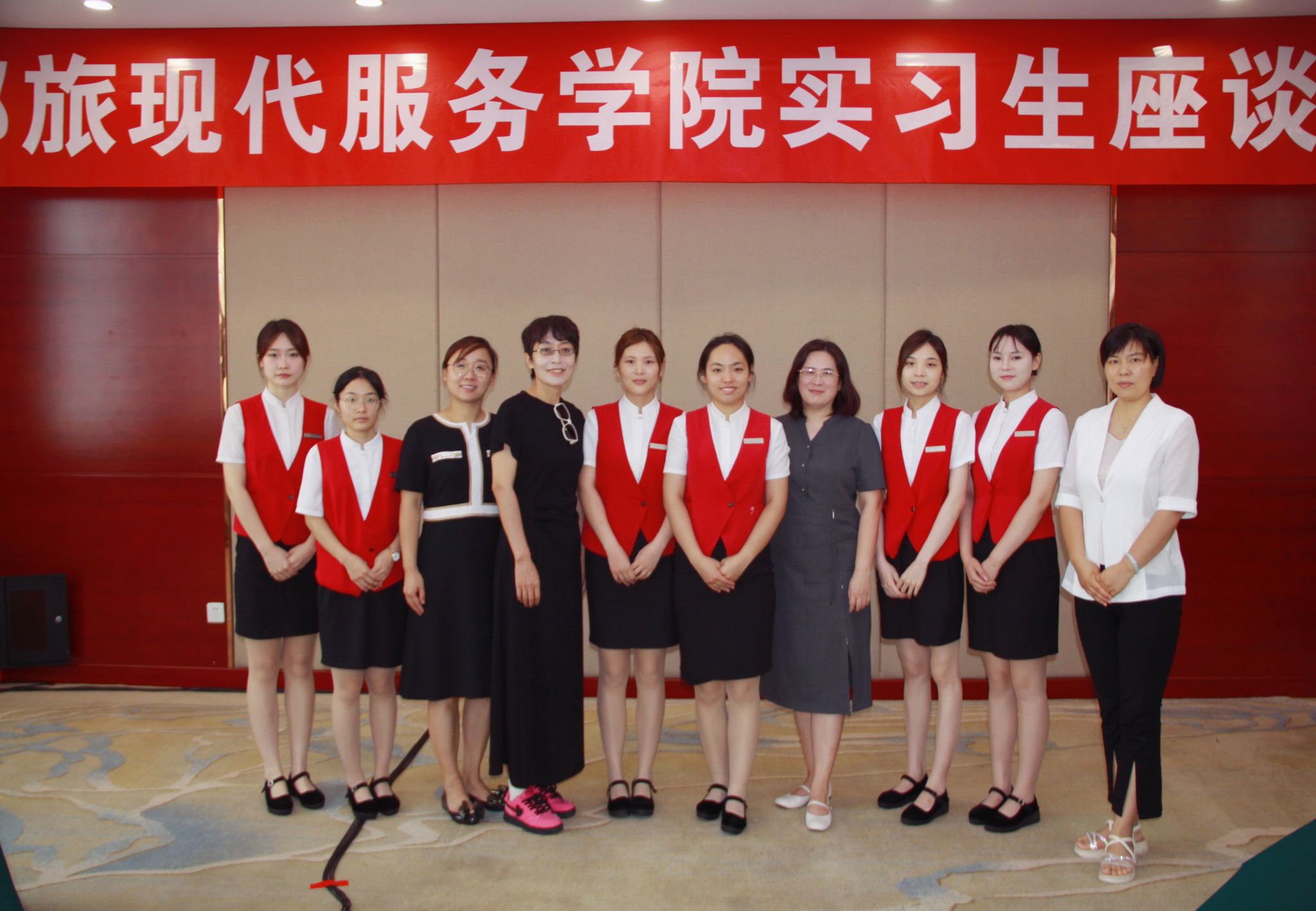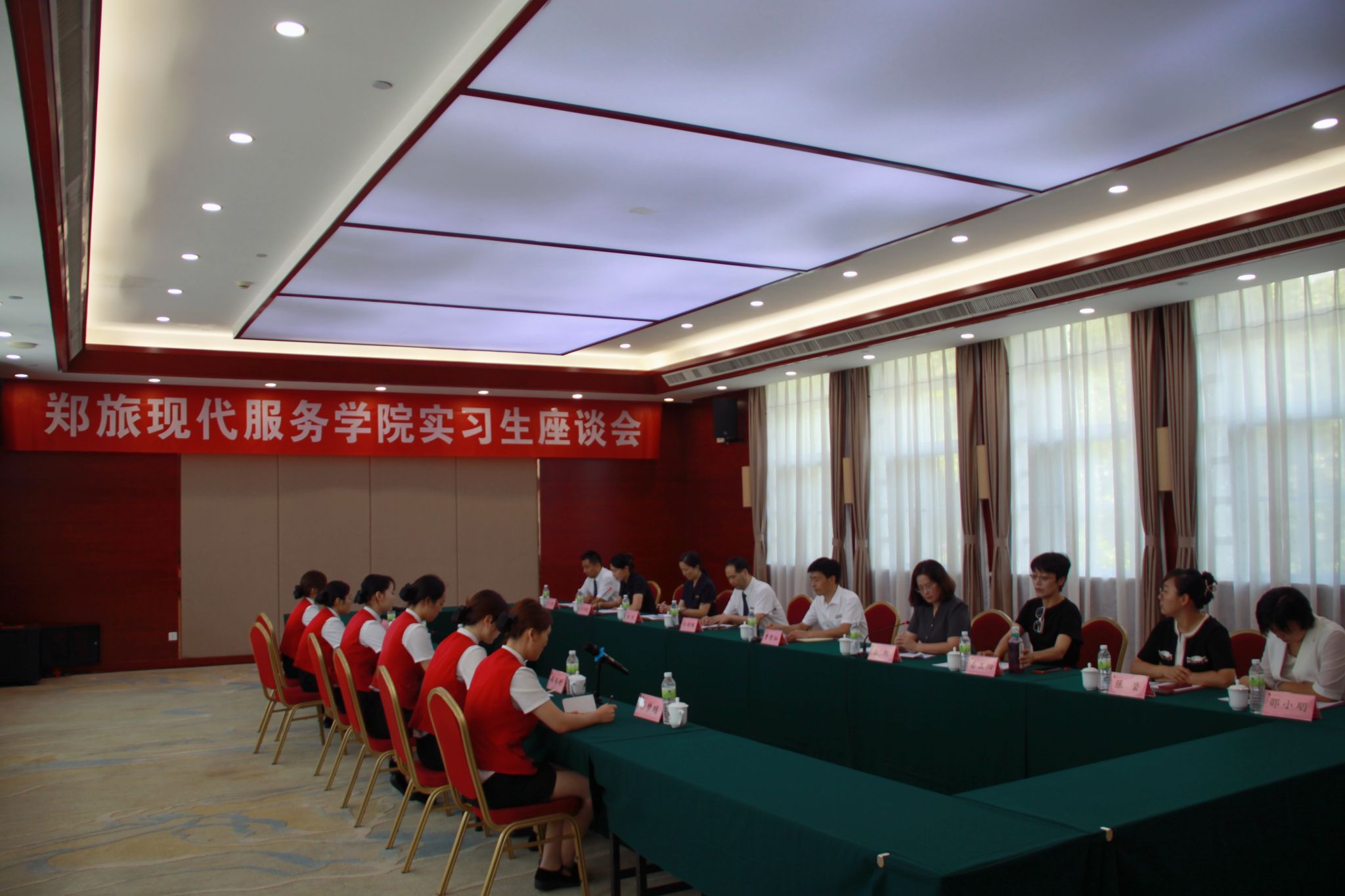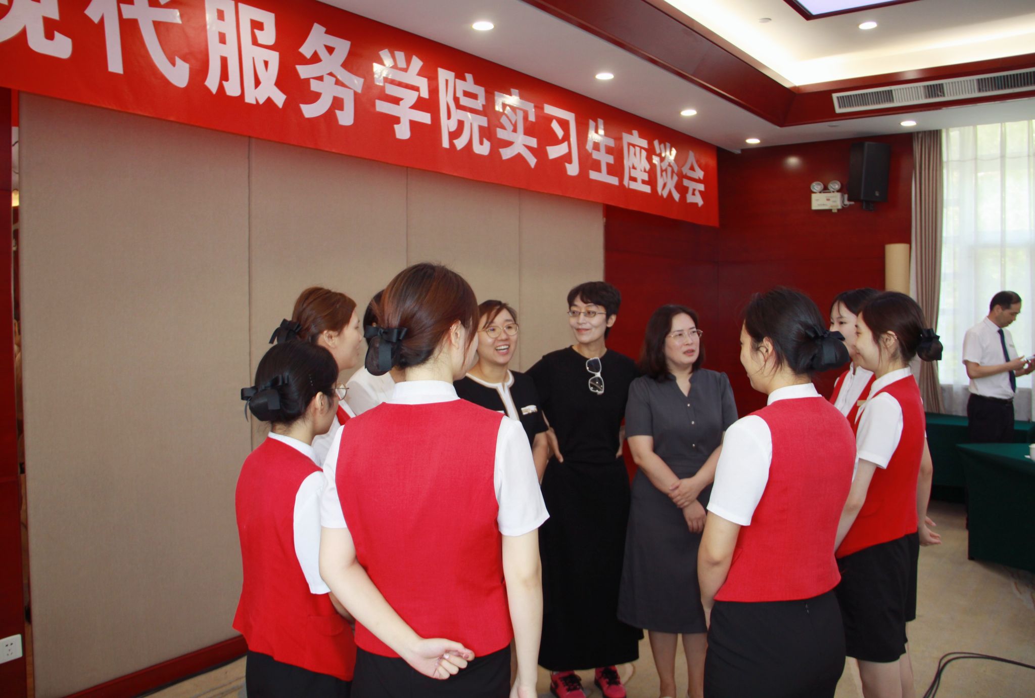 活动在嵩山饭店酒店餐西二层会议室顺利举行,参会人员包党总支书记白娜、党总支副书记岳正阳、教工党支部书记张莹和实习实训干事邵小明,以及嵩山饭店行政总监曹哲灿、人资质培经理孙晓鹏、党政事务主任杨帆、政务会议接待服务部副经理高关偶露、人资主管王强等。此外,还有6位正在酒店实习的学生代表参加了此次座谈会。