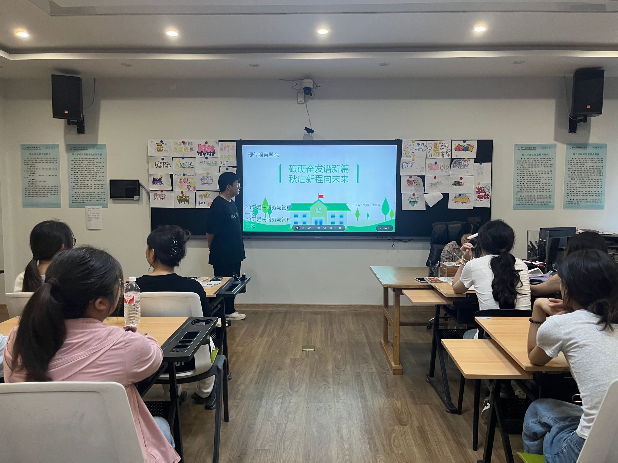 为积极引导同学们尽快适应新学期的校园生活,进一步推进新学期的教学工作,提升学生核心素养,帮助学生更好地适应新环境,以积极的心态迎接新的学期,现代服务学院于9月2日组织各班级在1A教学楼开展“砥砺奋发谱新篇 秋启新程向未来”主题班会。现代服务学院党总支书记白娜、学生党支部书记段会利深入我院检查督导。