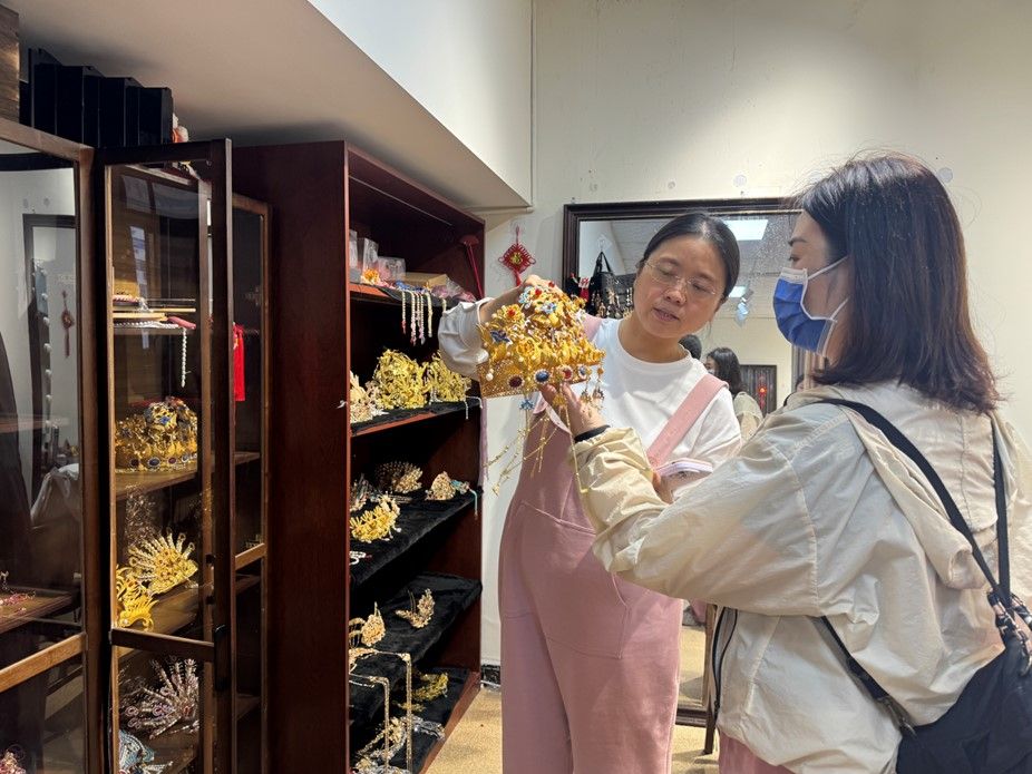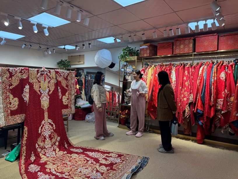 在参观过程中,教师们有幸参观了传统的中式婚礼所需的各种服装、道具。公司的布置充满了中国古典元素,从各式各样的汉服礼服到非遗手艺发饰,每一处细节都透露着浓厚的中华传统文化气息。教师们通过企业老师对于中式婚礼的讲解,如拜堂、交杯酒等环节,深刻感受到了中国婚礼文化的独特魅力。