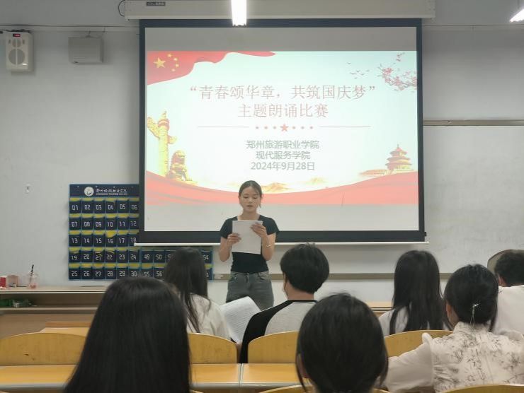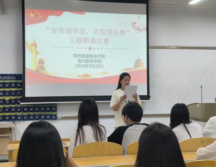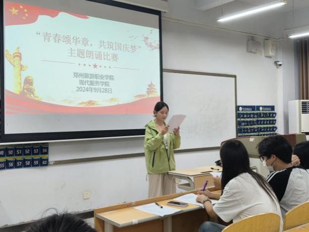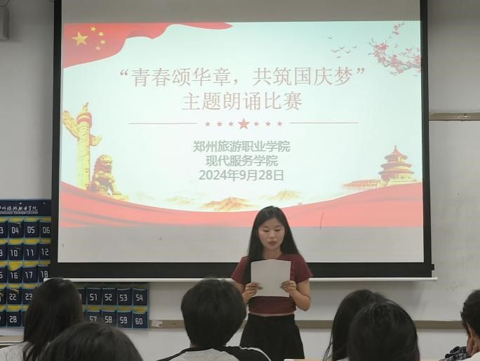 为庆祝中华人民共和国成立75周年,继承红色血脉,激发爱国热情,现代服务学院于近日开展了以“青春颂华章,共筑国庆梦”为主题的朗诵比赛,十几名同学依次登台,用饱含深情的声音抒发对祖国的热爱。