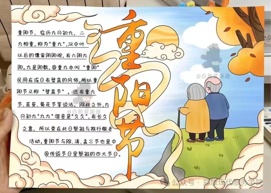 活动期间,同学们纷纷发挥自己的创意和才华,以重阳节为主题,制作了一幅幅作品主题鲜明、风格各异,既有描绘重阳登高、赏菊等传统习俗的手抄报,也有表达敬老爱老情感的书法作品。在创作过程中,同学们不仅加深了对重阳节文化的了解,也锻炼了自己的设计能力和艺术修养。