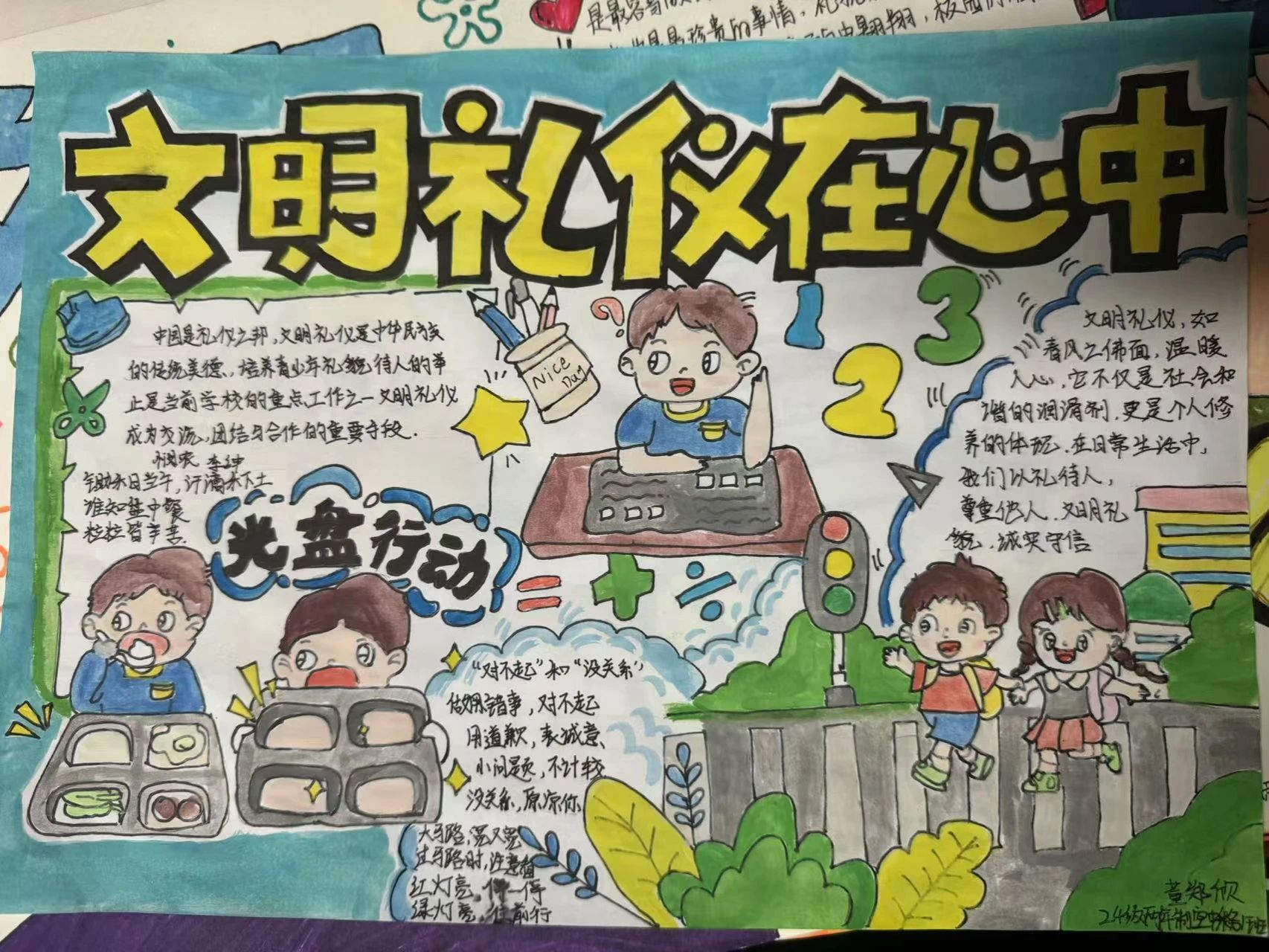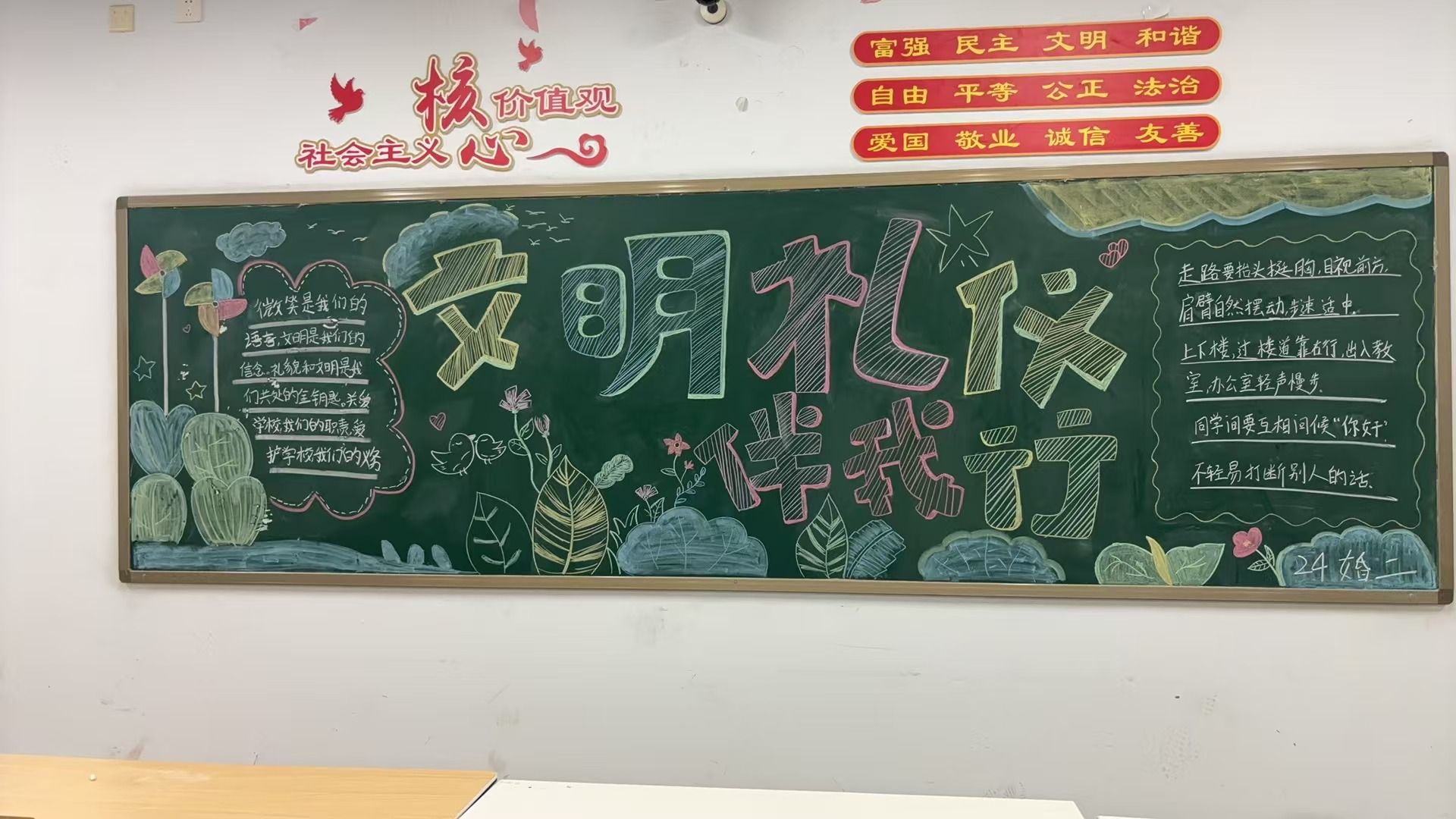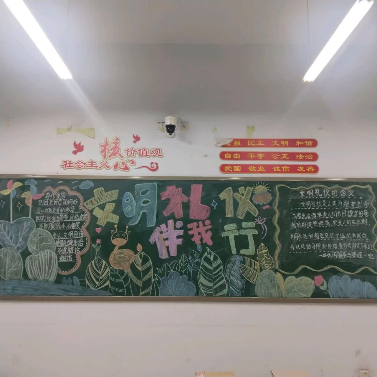 为营造浓郁的知礼、懂礼、讲礼、行礼的校园文化氛围,同学们用彩色粉笔绘制出对文明礼仪的理解。各班的黑板报内容充实,构思新颖,书写规范,充分展现了同学们懂礼知仪的精神品质,营造了积极健康的校园环境。