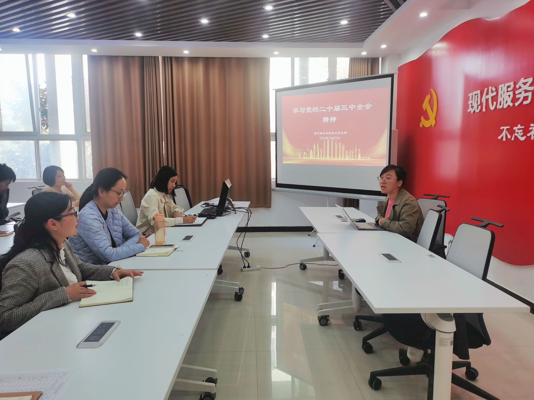 为进一步学习贯彻落实党的二十届三中全会精神,推动学院党建与事业发展深度融合,深刻领会学习党的二十届三中全会精神, 10月24日,现代服务学院教工党支部在1A208召开党的二十届三中全会精神党日活动。会议由现代服务学院教工党支部书记张莹主持,全体教工党支部党员参加。