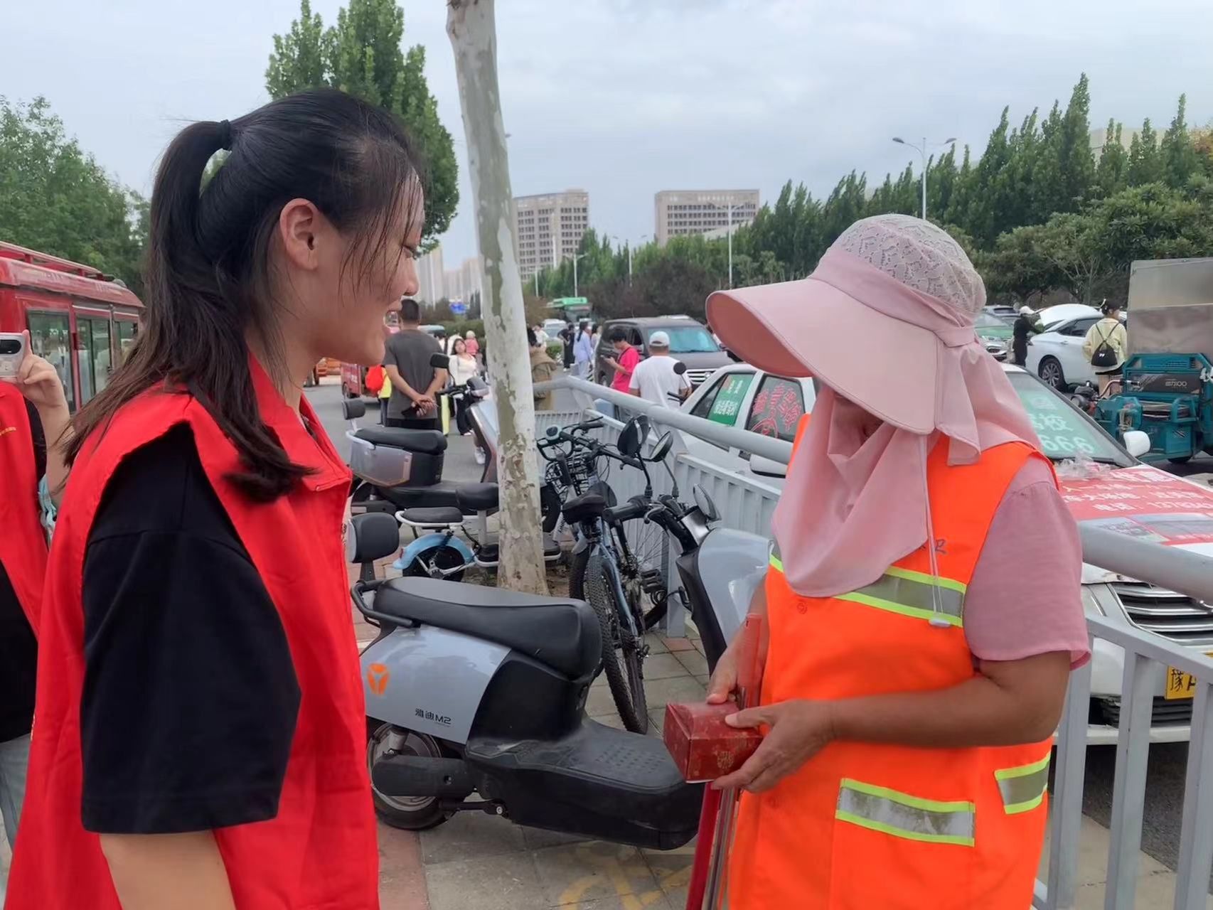 活动当天,清晨的第一缕阳光洒落在整洁的街道上,一群身着“红色马甲”的青年志愿者——现代服务学院的入党积极分子们,早已在学院周边社区集合完毕,手捧精心准备的月饼、小扇子等慰问品,整装待发。随着支部书记的一声令下,志愿者们分组前往各条街道,寻找正在辛勤工作的环卫工人。
