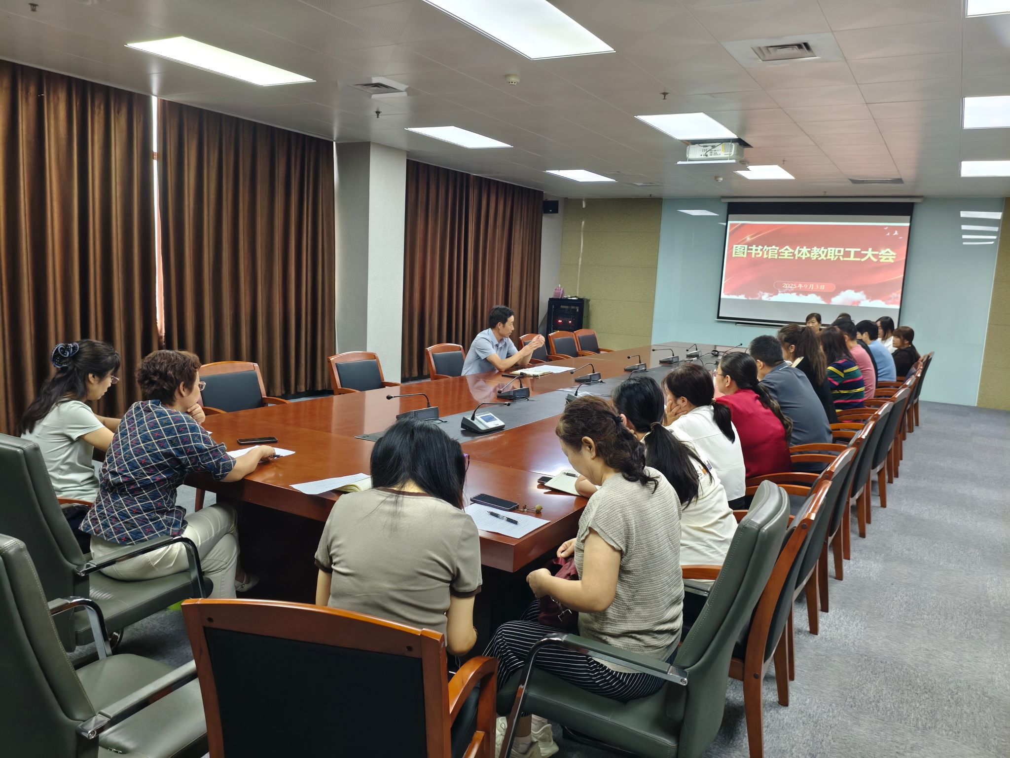 9月3日,图书馆召开新学期第一次全体教职工会议,全面听取每位教职工及工勤人员的工作介绍和新学期工作打算,并对新学期重点任务进行了安排部署。会议由胡志霞馆长主持。