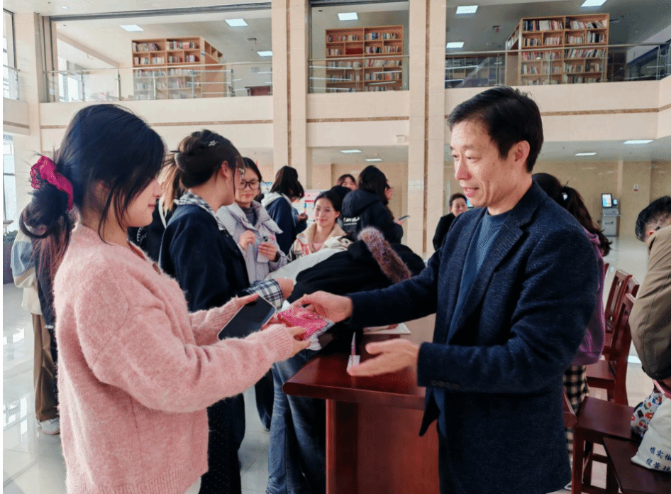 胡志霞亲自为参与学生颁发纪念品,并勉励大家常怀感恩之心,善读书、勤思考,将传统节日文化与专业学习相结合,做有文化、有温度的青年。此外,图书馆还同步推出“重阳主题书展”,在四楼阅览室陈列重阳文化典籍、敬老主题读物及旅游民俗专著,展期持续至11月2日,为全校师生提供沉浸式阅读体验,进一步延续节日温情。