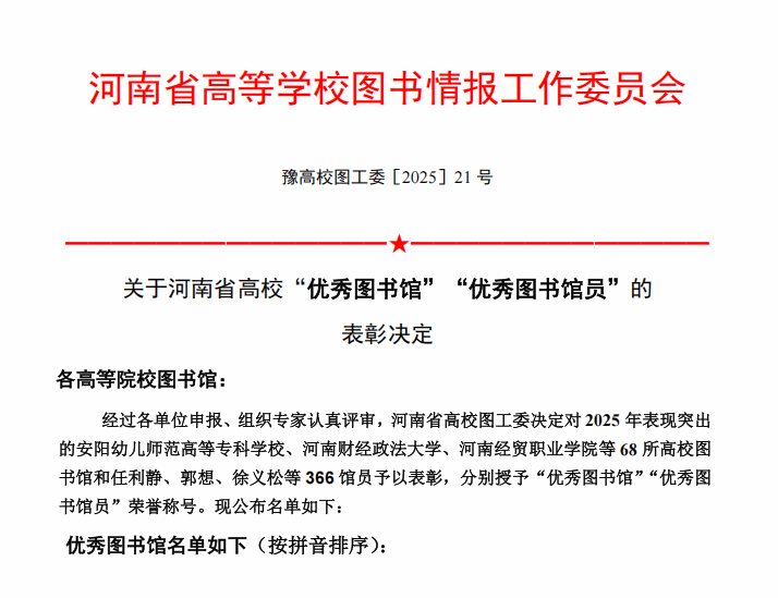 近日,河南省高等学校图书情报工作委员会下发了《关于河南省高校“优秀图书馆”“优秀图书馆员”的表彰决定》(豫高校图工委[2025]21 号)。经过各单位申报与严格评审,pp电子图书馆脱颖而出,荣获“优秀图书馆”称号,馆员郭丹丹荣获“优秀图书馆员”称号。