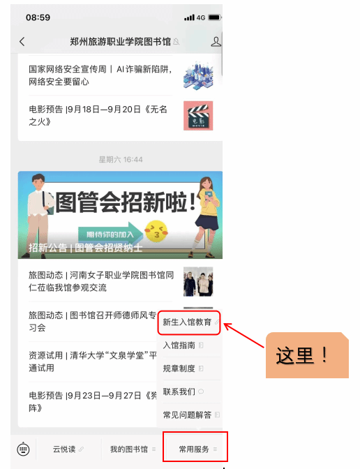 1.关注pp电子游戏平台网站微信公众号(扫描下方二维码),选择“常用服务”,点击“新生入馆教育”。
