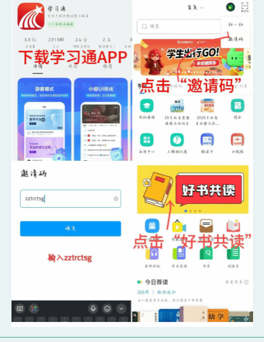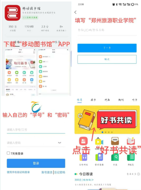 登录移动图书馆APP或学习通APP,在首页右上角输入邀请码“zztrctsg”进入图书馆活动首页;进入共读活动,选择书籍进行阅读、评论与打卡。