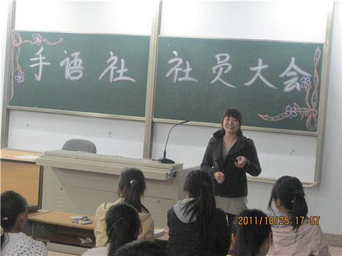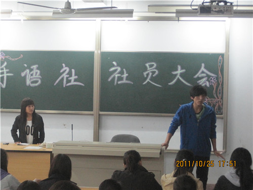 2011年10月25日下午5时,旅游管理系手语社在东教学楼203多媒体教室召开了手语社社员大会,会议在手语社社长程雪萍的讲话中拉开了帷幕,参加这次会议的有30人左右。