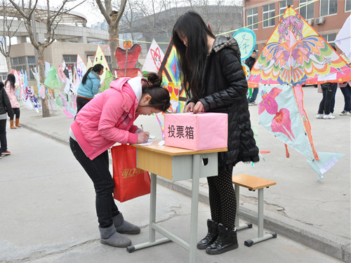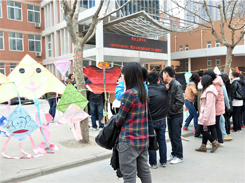 院团委在西教学楼前展出了同学们手工制作的风筝。形态各异五彩缤纷的风筝,吸引了往来的人群。同学们纷纷和自己喜欢的风筝合影留念并给自己喜欢的风筝投票。