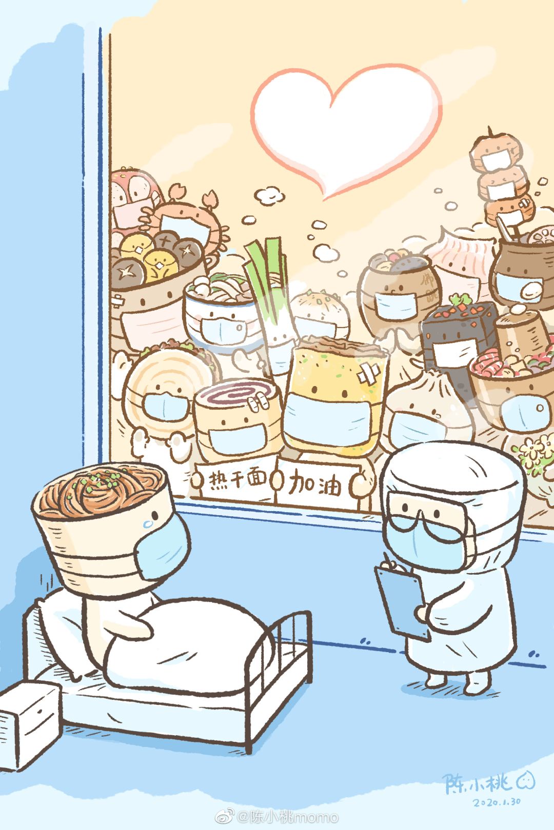 26岁的陈雨婷在自己微博上发送了一张后来被“刷屏”的漫画。画面中,煎饼果子、小笼包、火锅等一群美食卡通人物在为“热干面”加油鼓劲。“画一张温暖的画,相信一切都会好起来”,这就是她画这幅画的初衷。
