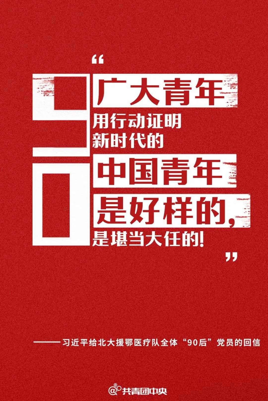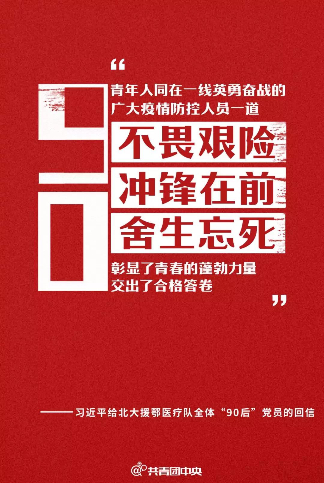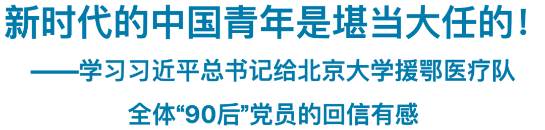 习近平总书记在给北京大学援鄂医疗队全体“90后”党员回信中指出,“在新冠肺炎疫情防控斗争中,你们青年人同在一线英勇奋战的广大疫情防控人员一道,不畏艰险、冲锋在前、舍生忘死,彰显了青春的蓬勃力量,交出了合格答卷。广大青年用行动证明,新时代的中国青年是好样的,是堪当大任的!”