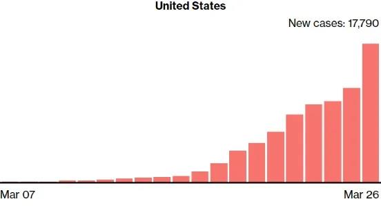△美国新增病例从26日开始加速增加 图片来源:彭博社