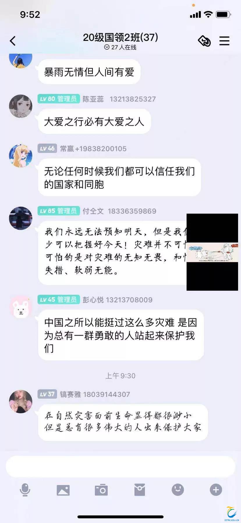 危机是最鲜活的教材,灾难是最深刻的课堂。下午我院分班级开展了“把灾难当教材 与祖国共成长”的主题班会。班主任、辅导员深挖河南救灾、战“疫”中思政教育资源,把身边发生的鲜活案例带进课堂,让同学们看到了党领导人民抗击灾难中所展现的中国速度和力量、民族精神和气魄,增强民族自信,培养同学们成为心有大我、肩有大任、行有大德的青年,做合格的社会主义的建设者和接班人。