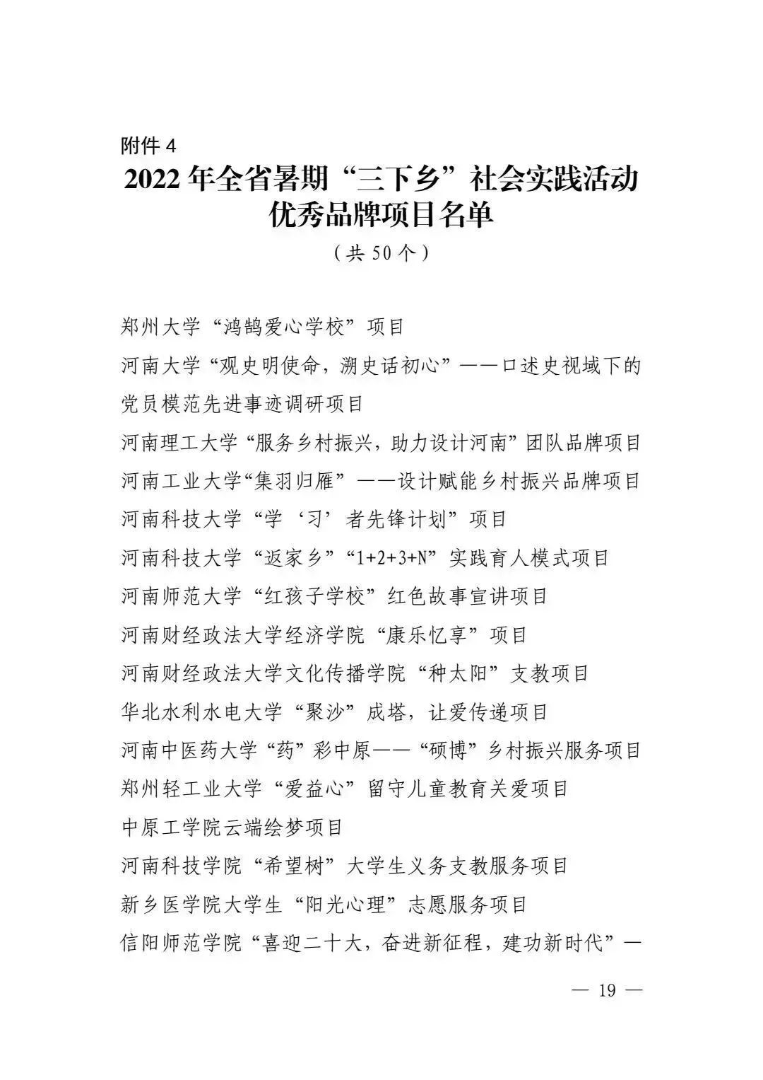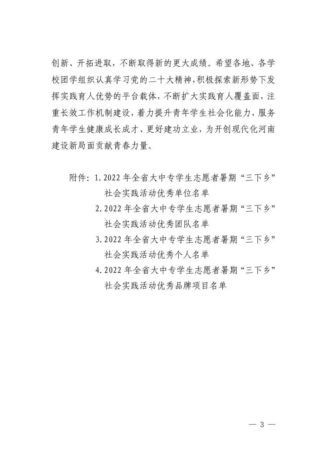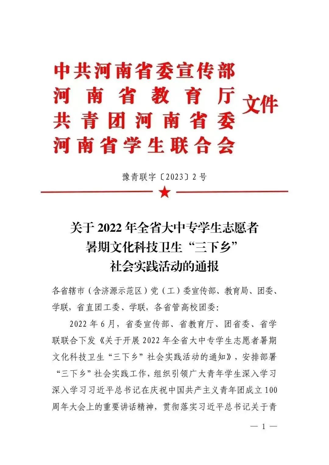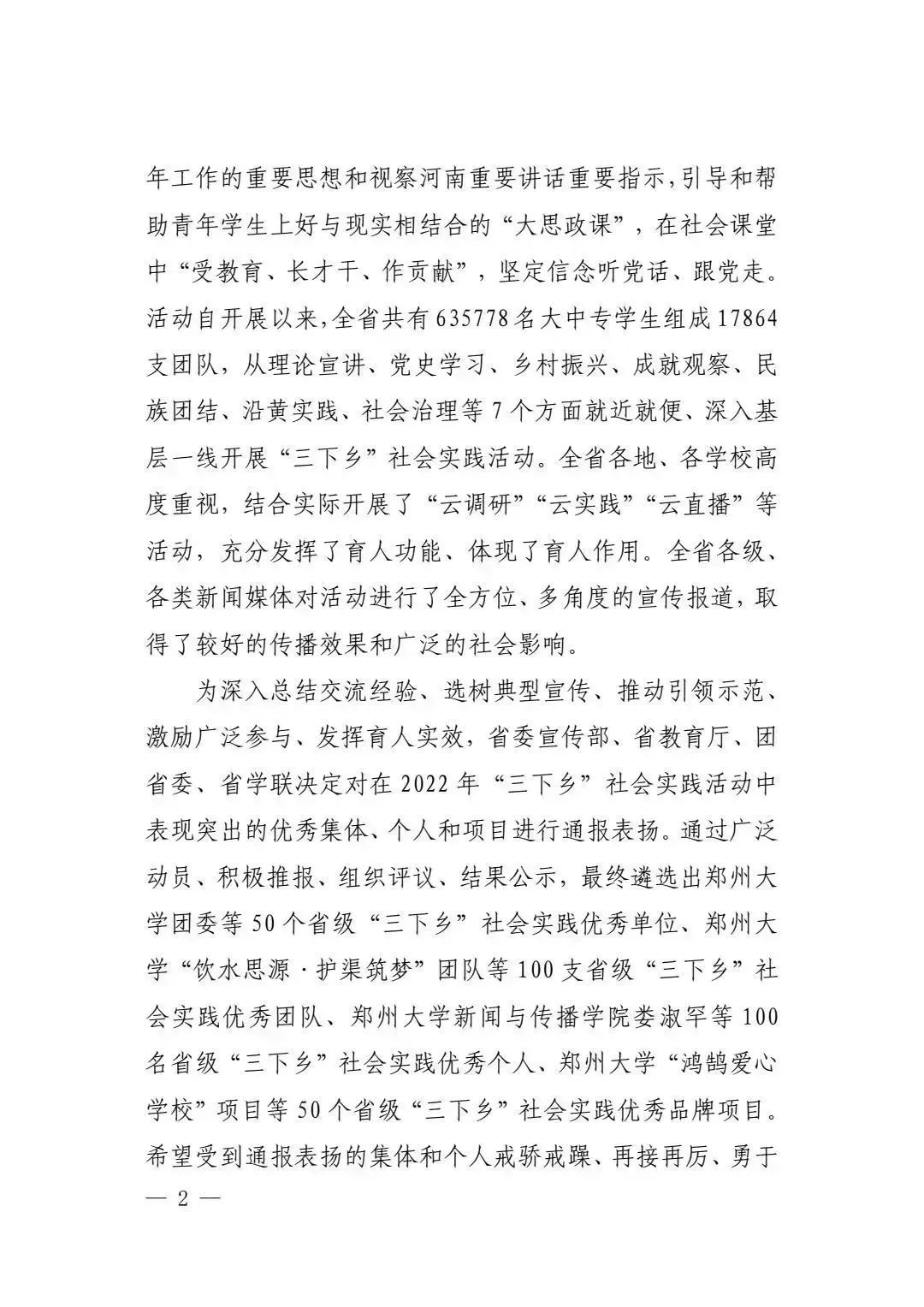 近日,中共河南省委宣传部、河南省教育厅、共青团河南省委、河南省学生联合会下发文件《关于 2022 年全省大中专学生志愿者暑期文化科技卫生“三下乡”社会实践活动的通报》(豫青联字〔2023〕2号)。