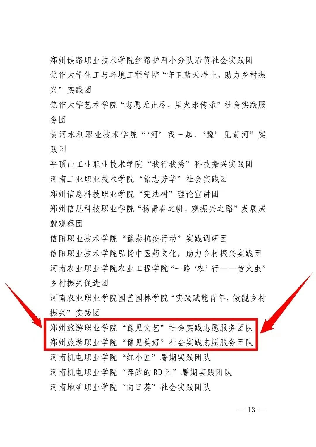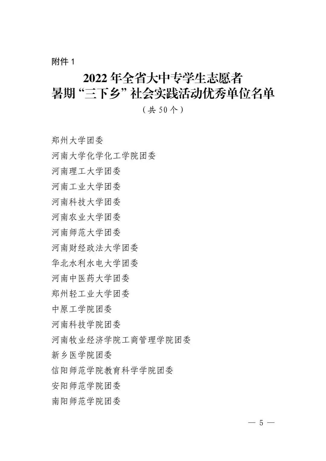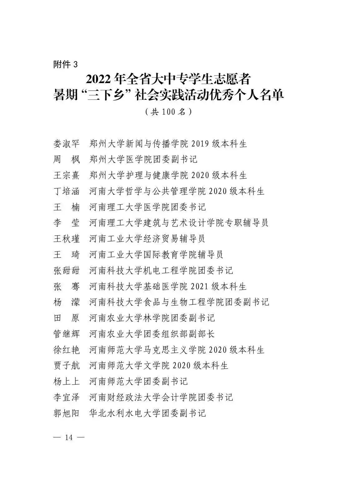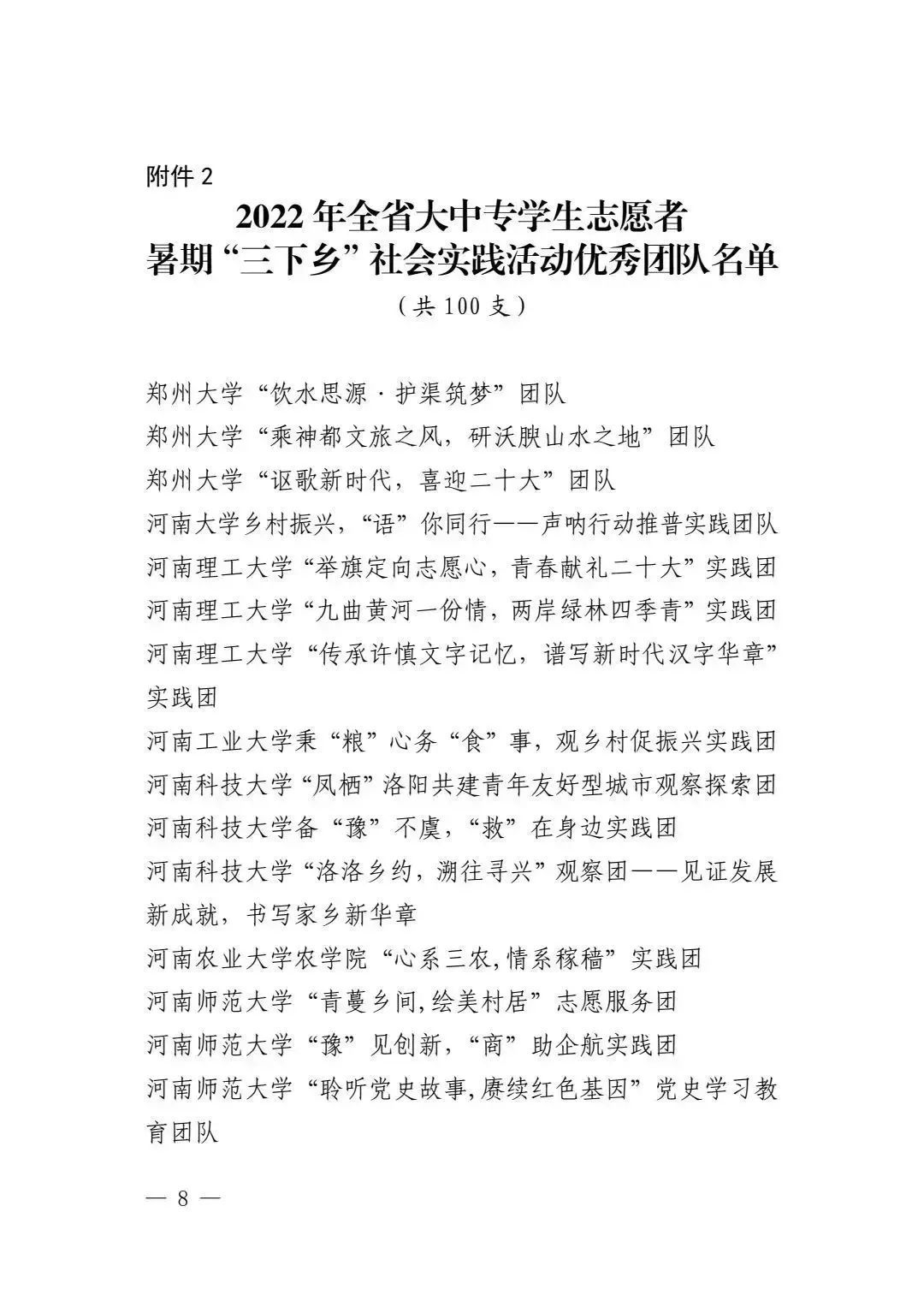 近日,中共河南省委宣传部、河南省教育厅、共青团河南省委、河南省学生联合会下发文件《关于 2022 年全省大中专学生志愿者暑期文化科技卫生“三下乡”社会实践活动的通报》(豫青联字〔2023〕2号)。