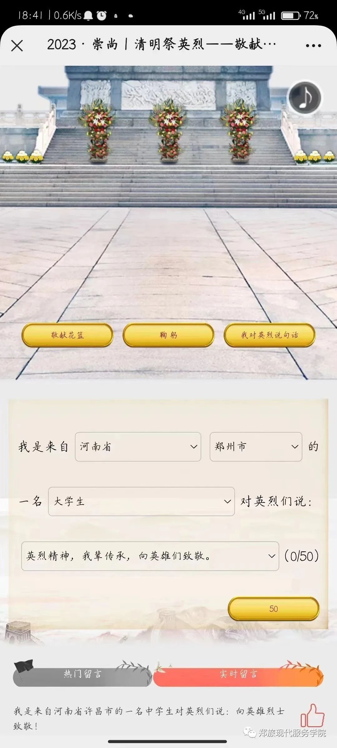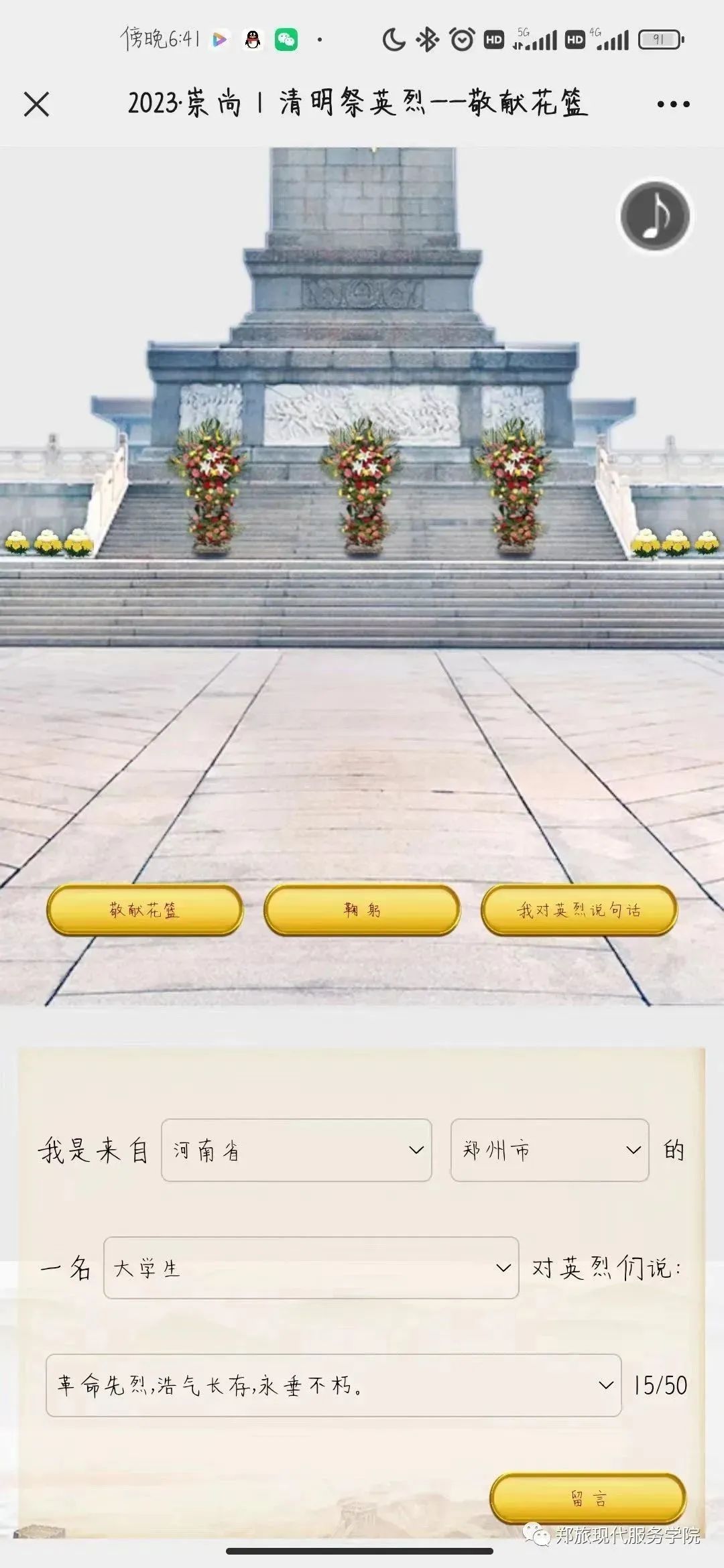 2023年4月4日,现代服务学院开展“网上祭英烈”活动。 活动过程中,同学们积极参加网上祭奠活动,通过中国文明网进行献花、点蜡烛、鞠躬、行队礼、网上寄语等方式缅怀先烈,寄托哀思,用真挚语言表达着对先烈的崇敬之情。