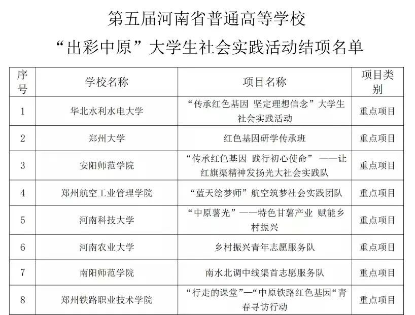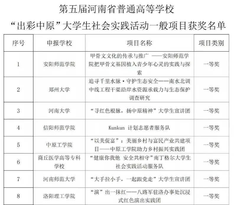 近日,河南省教育厅公布《关于河南省普通高等学校“出彩中原”大学生社会实践活动项目结项和获奖名单的公示》。