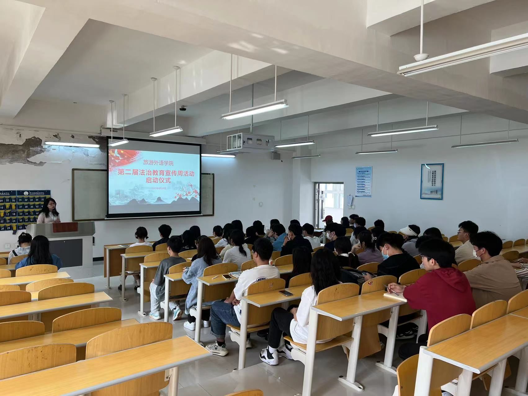 为了进一步推进依法治教、依法治校、依法办学,教育引导师生人人知法、人人守法,切实提升学生的法治意识和法治素养。4月18日,旅游外语学院在4B211开展第二届法治教育宣传周活动启动仪式,本次启动仪式由赵义雯主持。