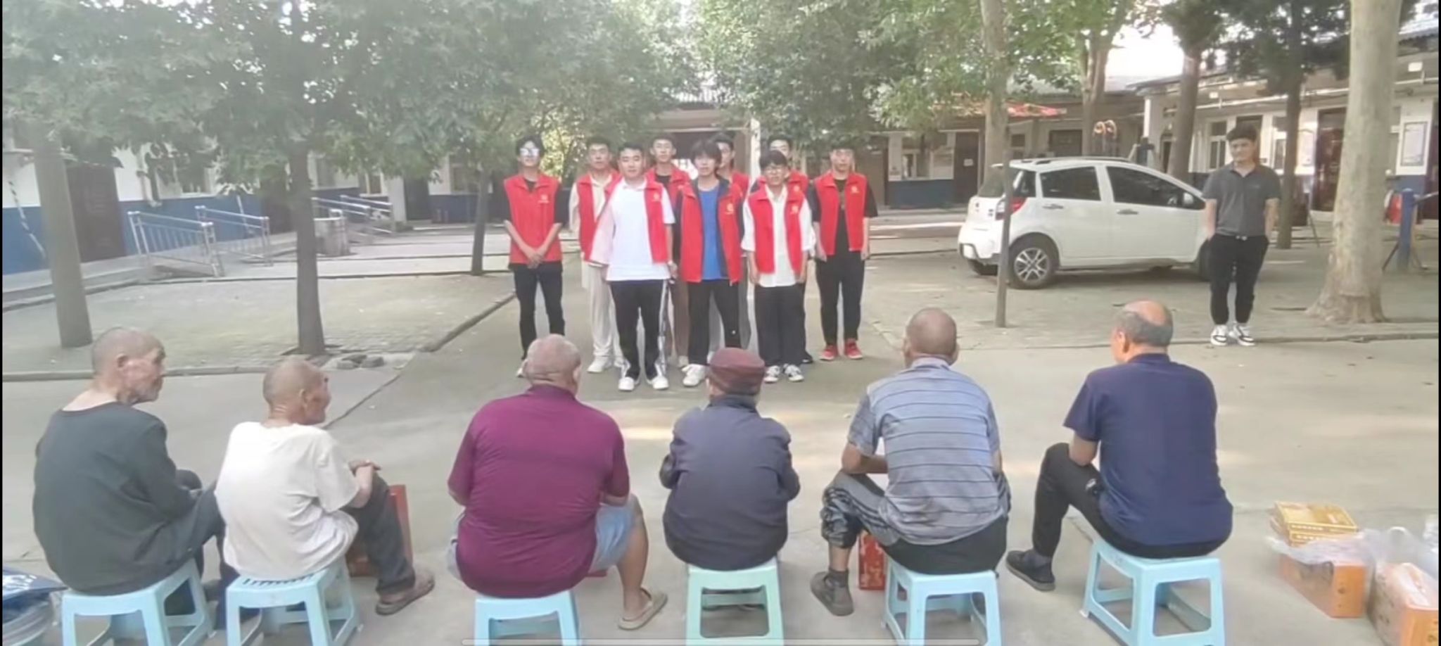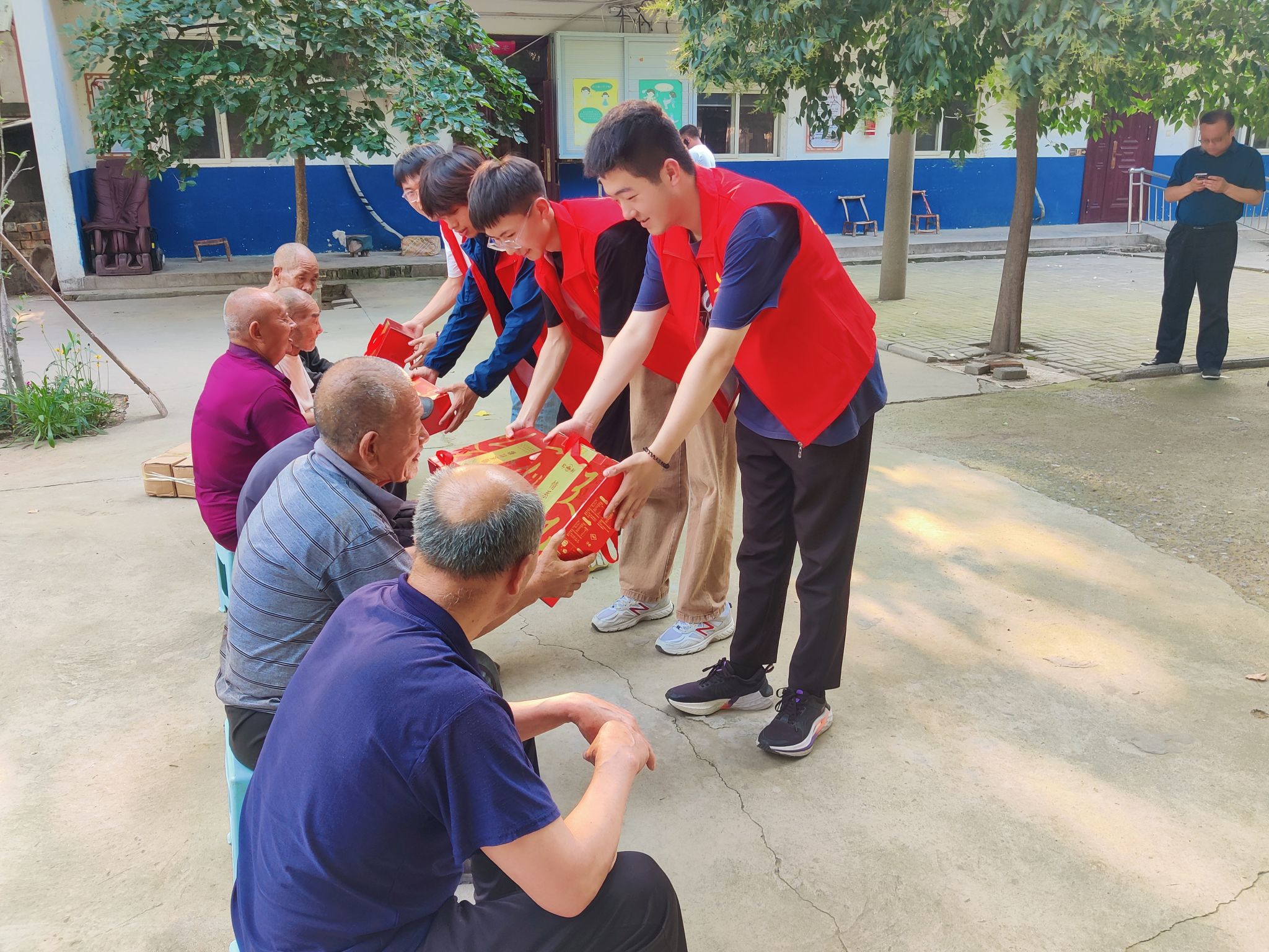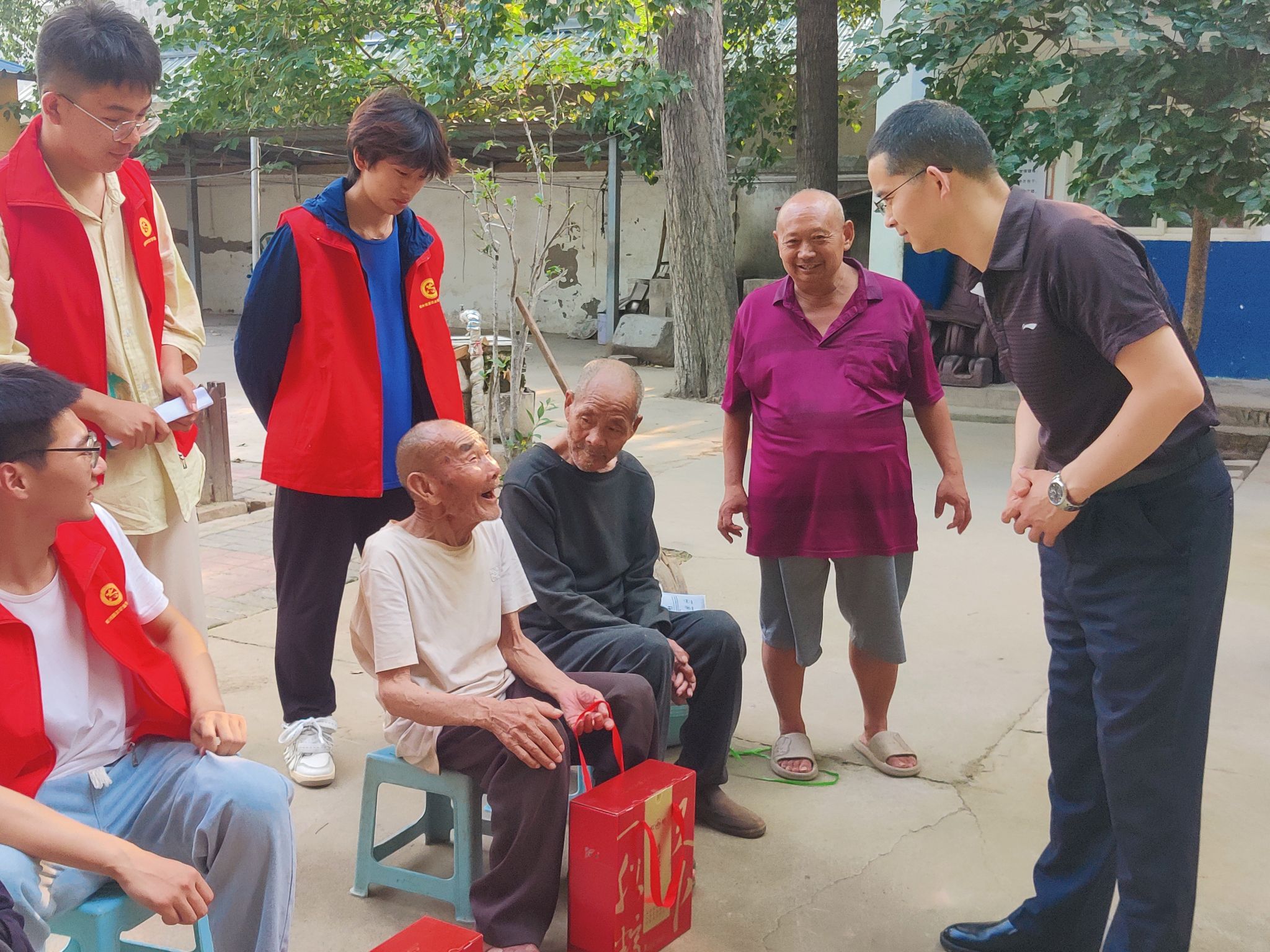 交流结束后,社会实践团队在冯镇长等一行领导的陪同下来到了万滩镇敬老院,酒店管理学院二级心理辅导站孙颜老师讲解了如何保持老年人的心理健康,敬老院的老战士给大家讲了红色故事,志愿者们带来了精彩的节目表演,并向敬老院的老人们和全体工作人员致以节日的祝福和问候。最后志愿者们为老人们送上了衣物、粽子、碗筷、棋盘等爱心物品。