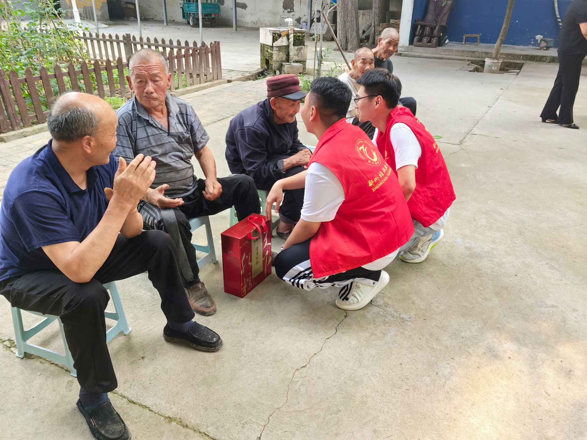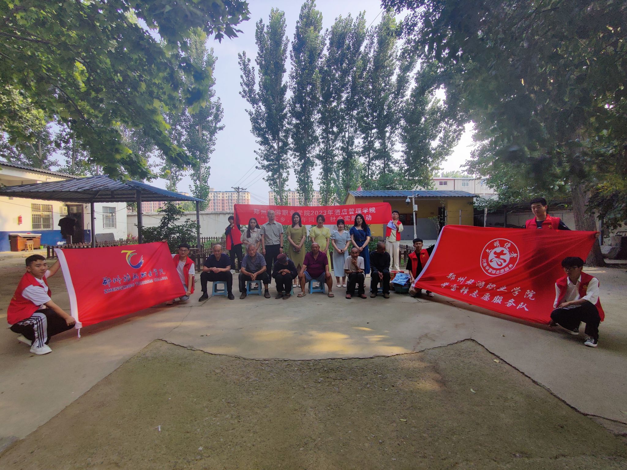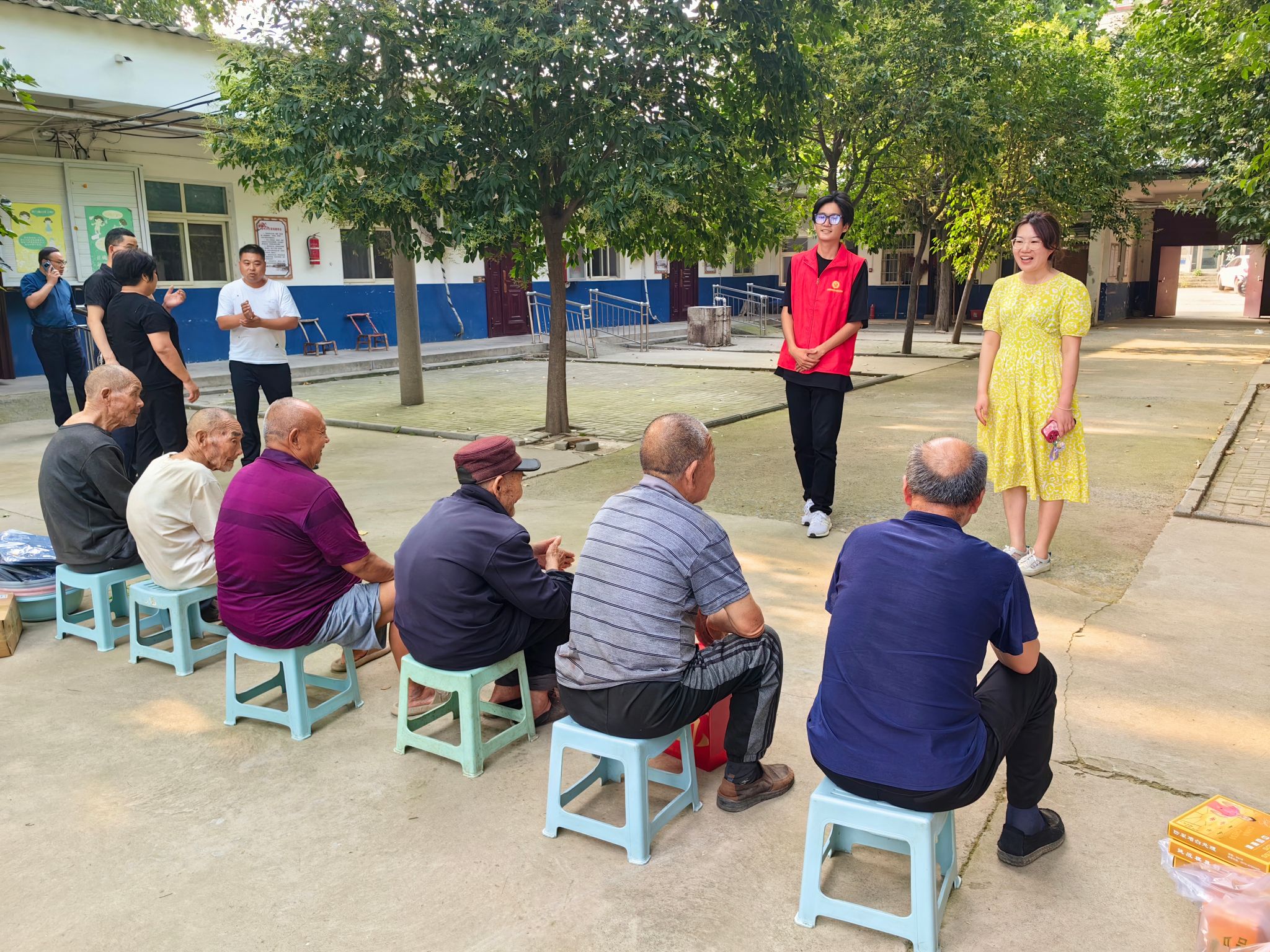 交流结束后,社会实践团队在冯镇长等一行领导的陪同下来到了万滩镇敬老院,酒店管理学院二级心理辅导站孙颜老师讲解了如何保持老年人的心理健康,敬老院的老战士给大家讲了红色故事,志愿者们带来了精彩的节目表演,并向敬老院的老人们和全体工作人员致以节日的祝福和问候。最后志愿者们为老人们送上了衣物、粽子、碗筷、棋盘等爱心物品。