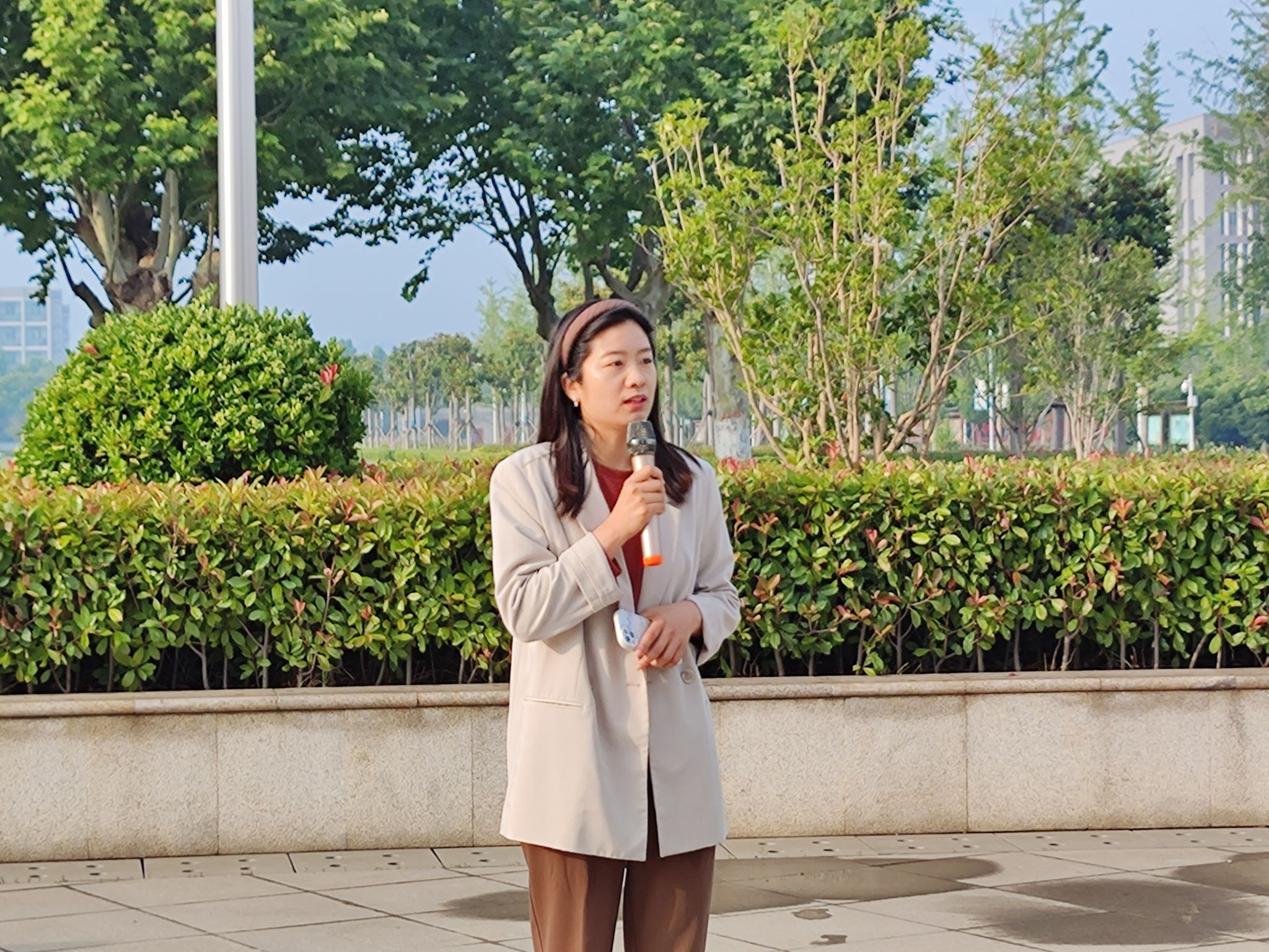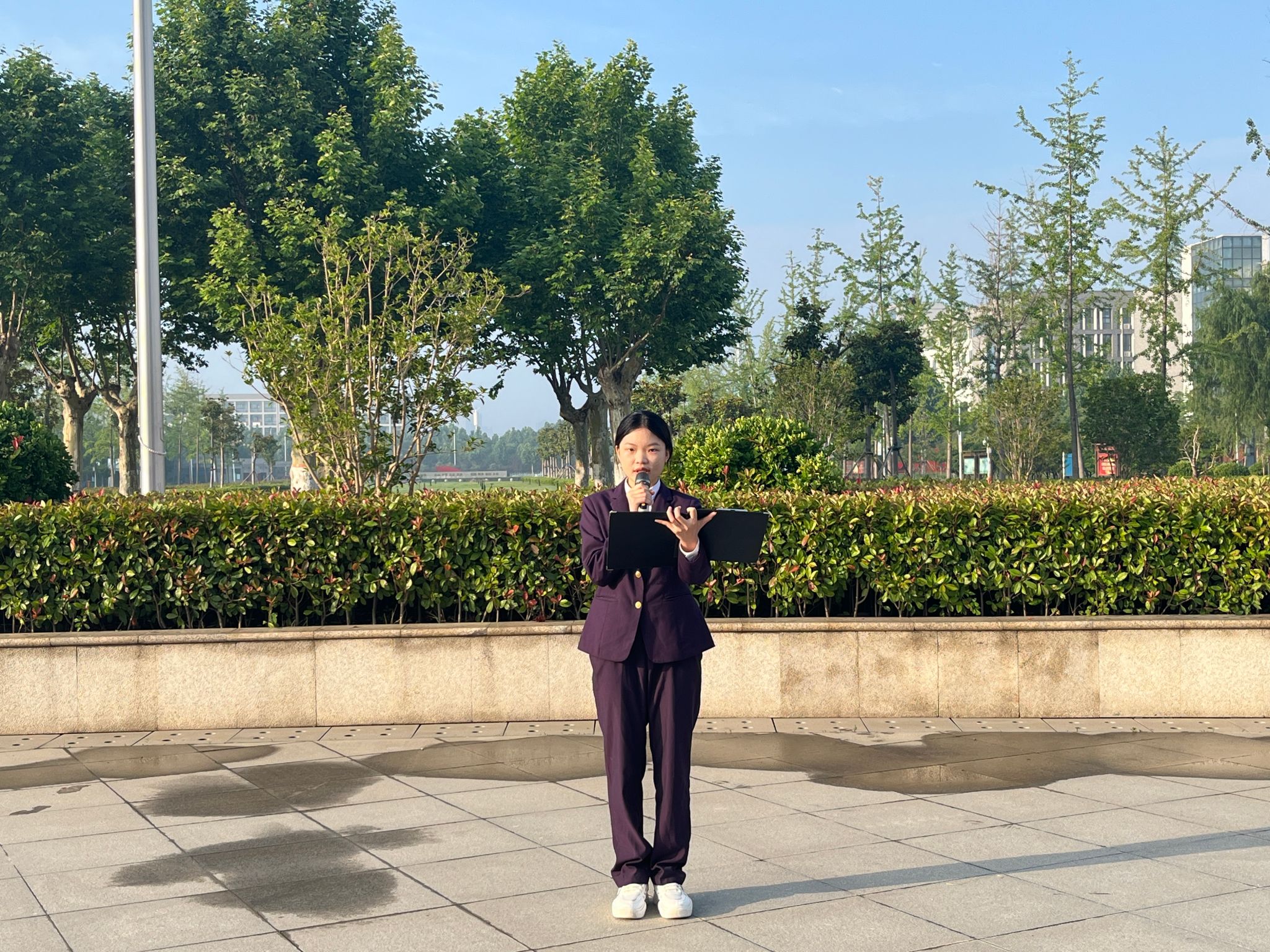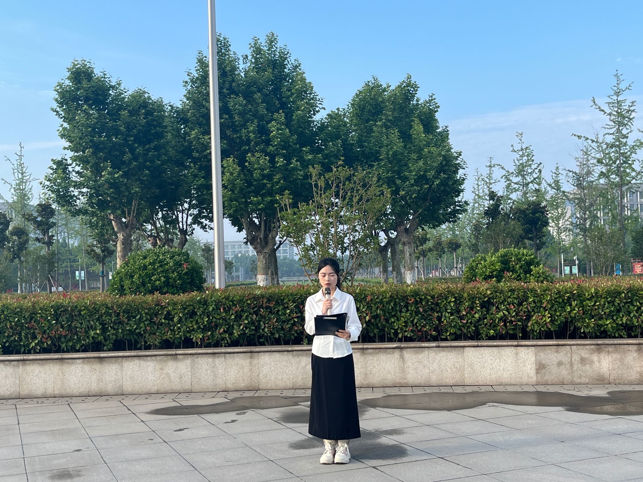 6点30分引导参加仪式学生入场就位,6点45分升旗仪式正式开始。校团委国旗护卫队迈着整齐的步伐走向升旗台,升旗手摆正国旗,护旗手列于两侧,随着嘹亮的国歌响起,鲜红的五星红旗飘扬着徐徐上升,旗手行军礼,全体师生行注目礼。升旗完毕后,由我院 22 级学生代表宋明珠发言,在发言中,她指出吾辈青年当始终赓续红色血脉,保持党的优良作风和光荣传统,吾辈青年当赓续红旗渠精神之火,要争做新时代的领跑人。随后,团支书书记刘晓丹老师发言,她用真切的话语对全体同学进行了鼓励,祝福 21 级同学们前程似锦,不负韶华,实习期间可以提升丰富自己,同时让 22 级 同学们对未来的大学生活充满希望,努力提升自己的能力。至此,升旗仪式圆满结束。