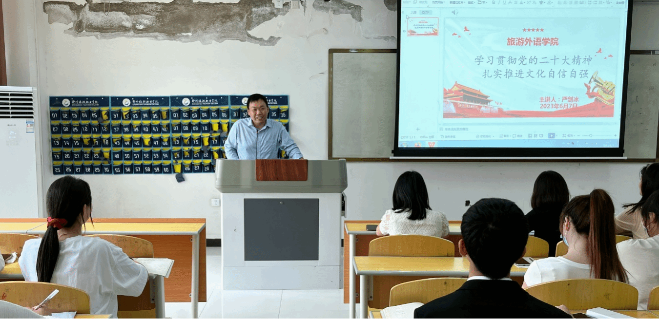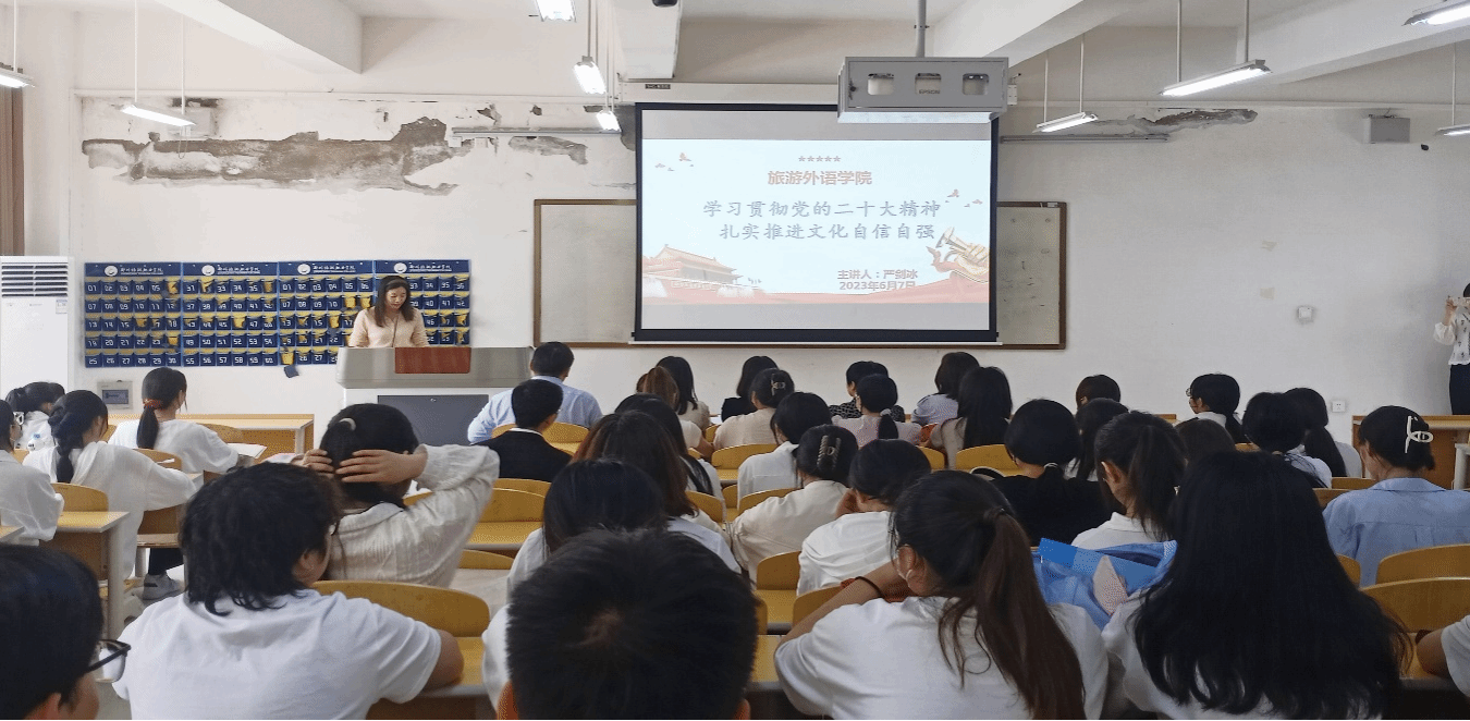 2023年6月7日以“学习贯彻党的二十大精神,扎实推进文化自信自强”为主题的专题讲座在旅游外语学院211阶梯教室举行,主讲人为马克思主义学院严剑冰博士,旅游外语学院院长张贺玲、党总支书记白娜、教师代表和全体团学干部、青马班学员和入党积极分子到场参加学习。