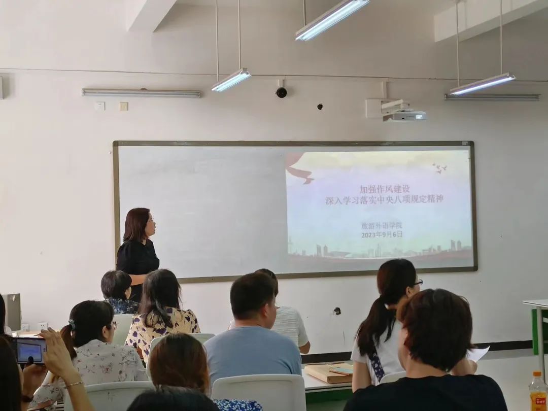 9月6日,旅游外语学院在清源楼207组织《加强作风建设 深入学习落实中央八项规定精神》专题学习活动。学院党总支书记白娜,院长张贺玲等全体教师参加学习活动。