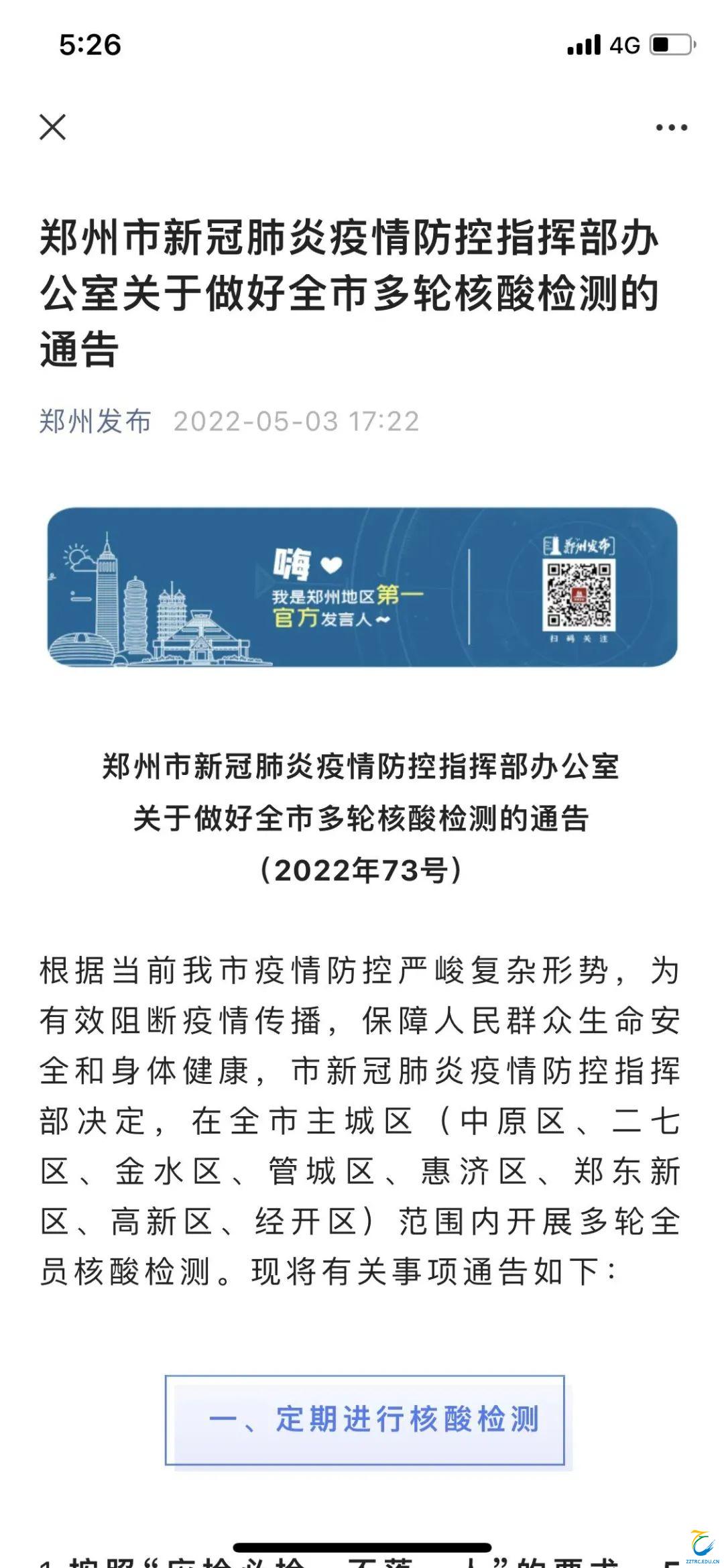 5月3日17:22,郑州市新冠肺炎疫情防控指挥部办公室发布2022年73号通告,决定在全市主城区范围内开展多轮全员核酸检测。机关事业单位、企业工作人员居家办公,严控人员流动风险。主城区内学校启动线上教学,寄宿制学校实施封闭管理。