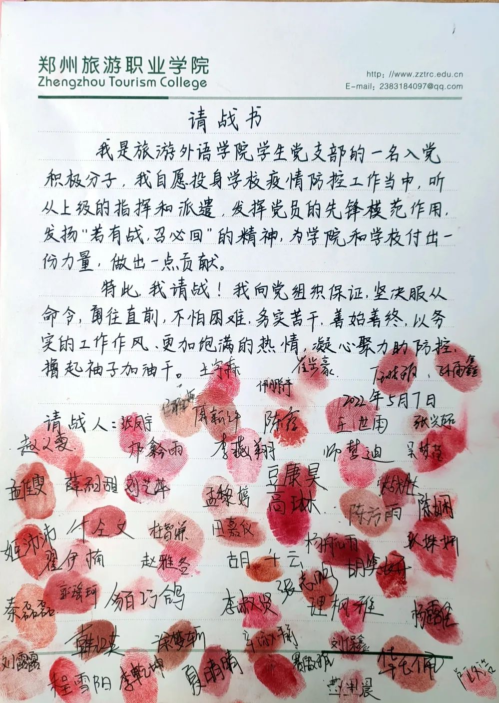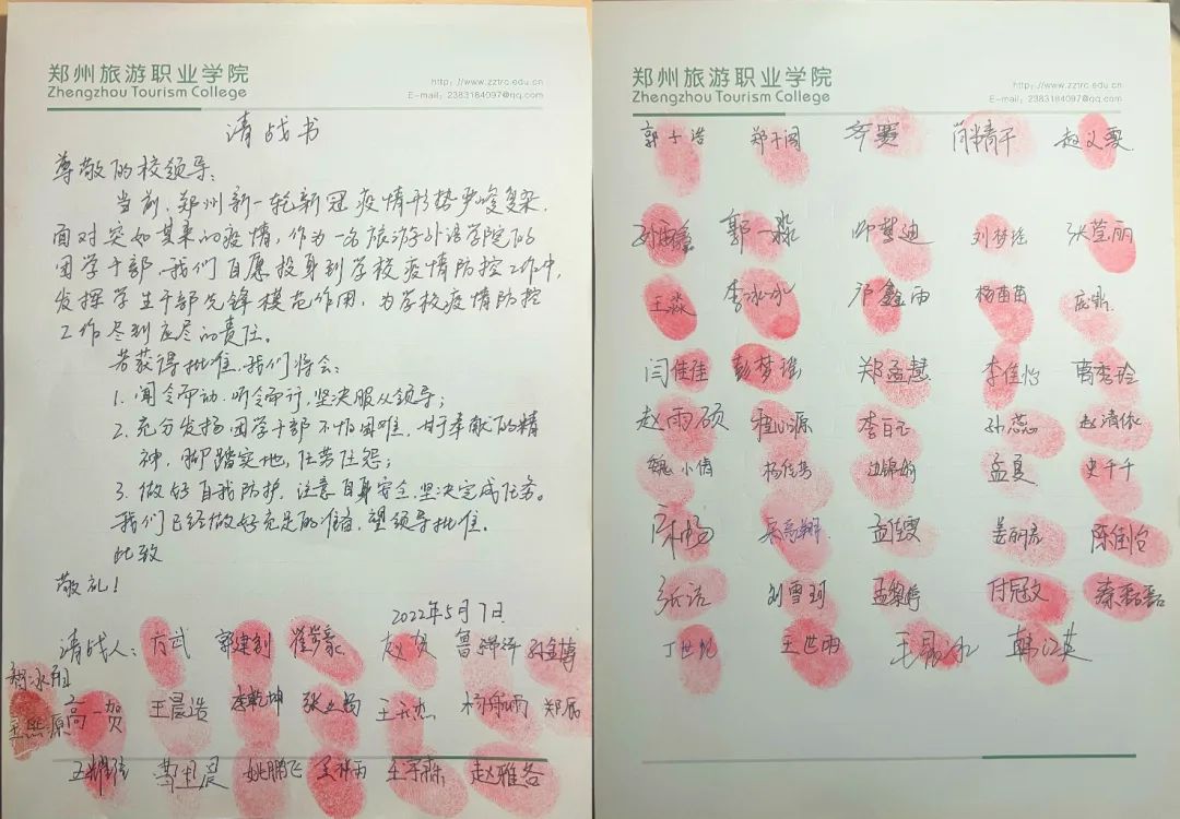 5月7日,旅游外语学院收到两份集体“请战书”,主动要求加入到抗疫志愿团队中,申请上密密麻麻地写着入党积极分子和团学干部的签名和手印。