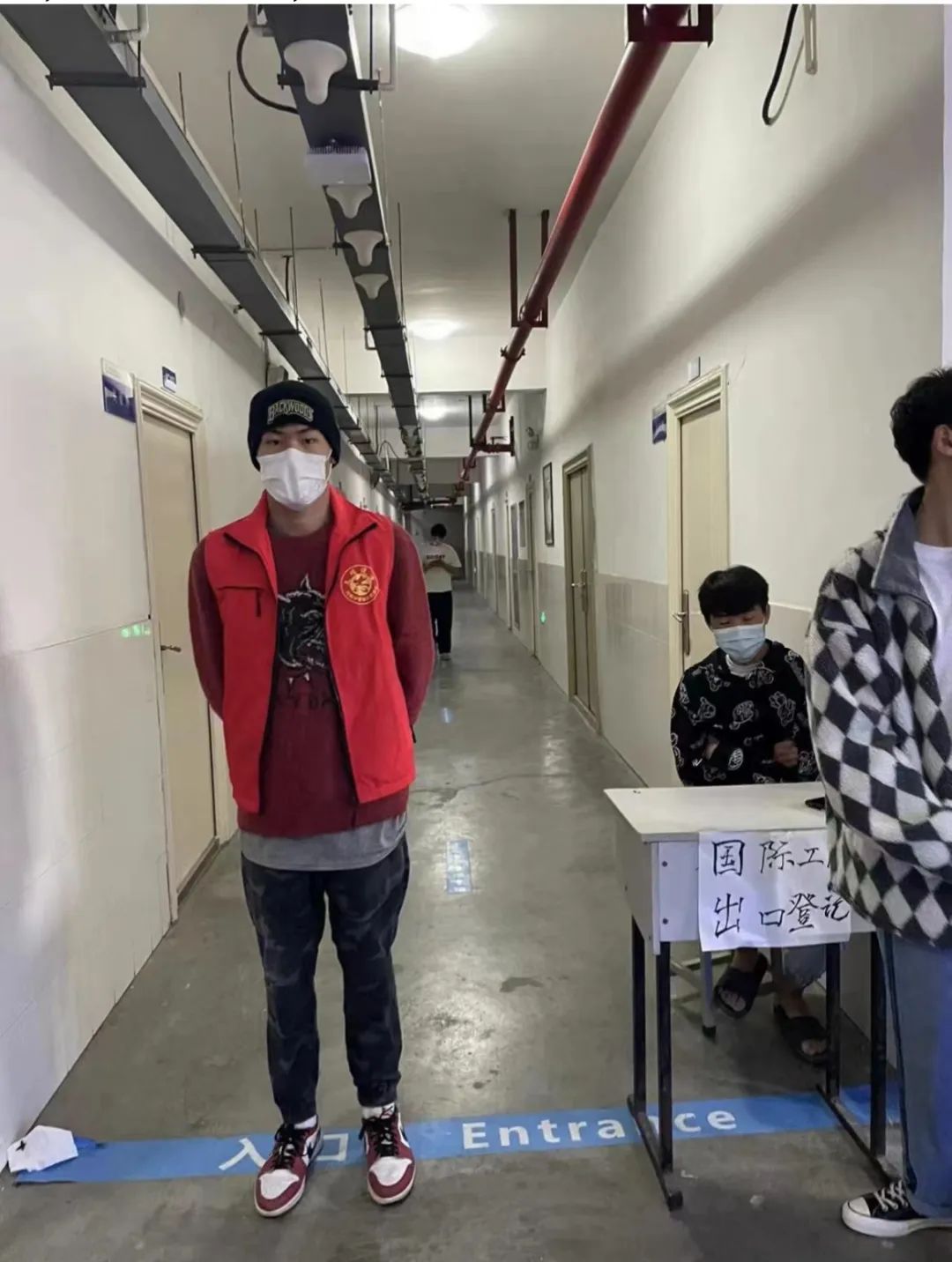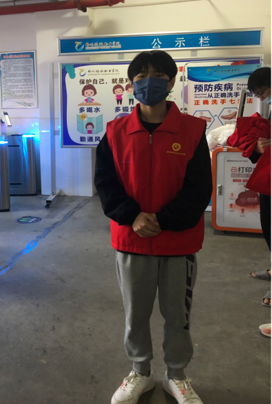 2022年5月7日,21级两年制市场营销1班潘李阳毅然加入疫情志愿者小组,参与院系防控工作。他主要负责登记出入宿舍人员信息,给每位出入的学生进行测温消毒,此外身为志愿者的他还跟随防疫工作者一起进行工作排查。