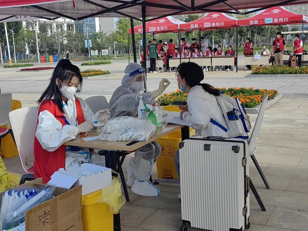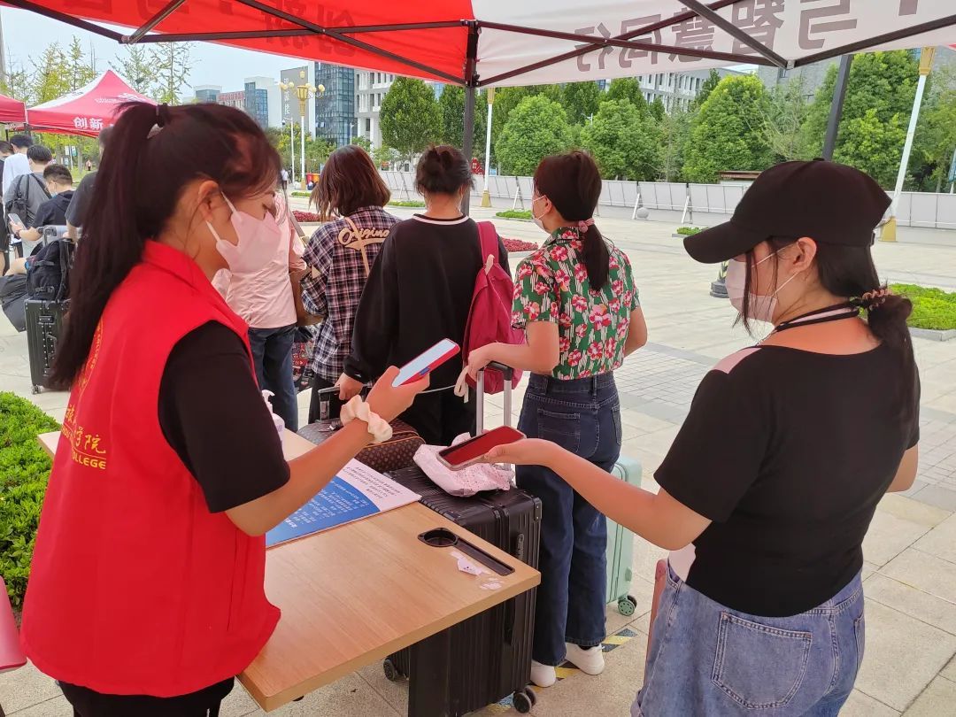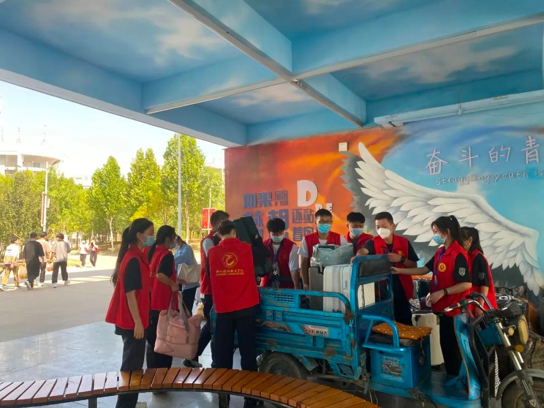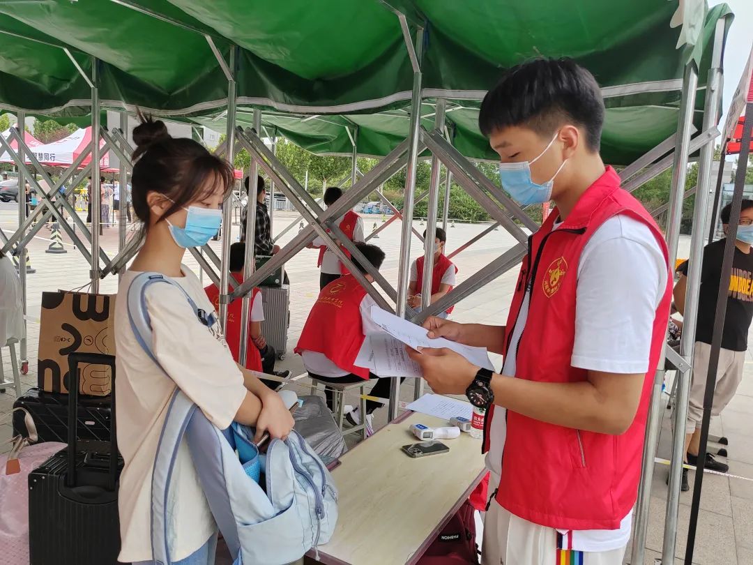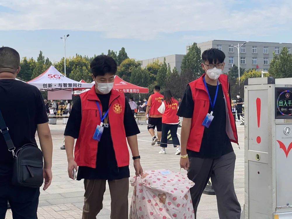 以心迎生,志愿先行。为助力老生顺利返校,让老生感受到学校的温暖,开启崭新的学期,校团委组织志愿者队开展迎接老生志愿活动。为积极响应学校疫情防控规定,全体师生全程佩戴口罩,志愿者工作在南门开展,并配有小推车。早晨7点20分,各位志愿者便已经迎着习习秋风在自己的岗位严阵以待了,他们身着统一红色志愿服,在做好个人防护的情况下,保障校门口出入的通畅,积极为返校老生服务,入校引导、测温消毒、审核健康档案、核酸检测、行李托运等系列志愿服务工作。暖心助人、热情奉献的“红马甲”成为青春校园里一道亮丽的风景线。