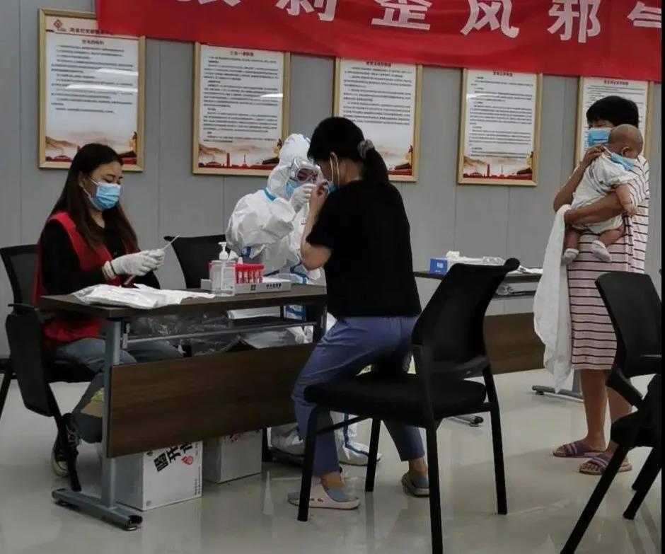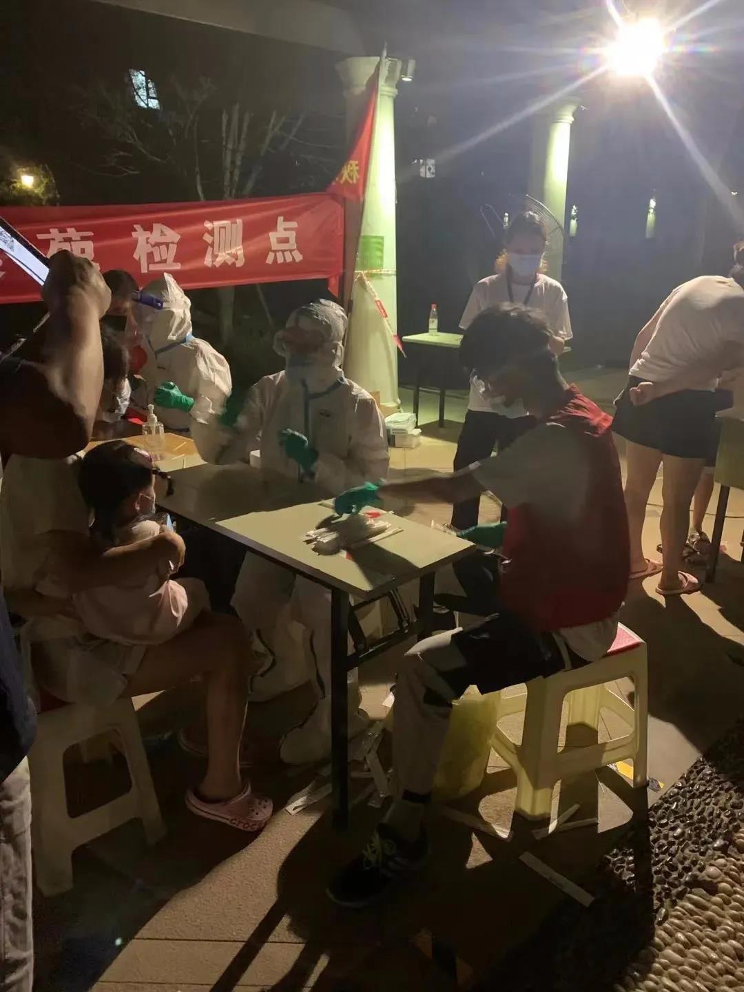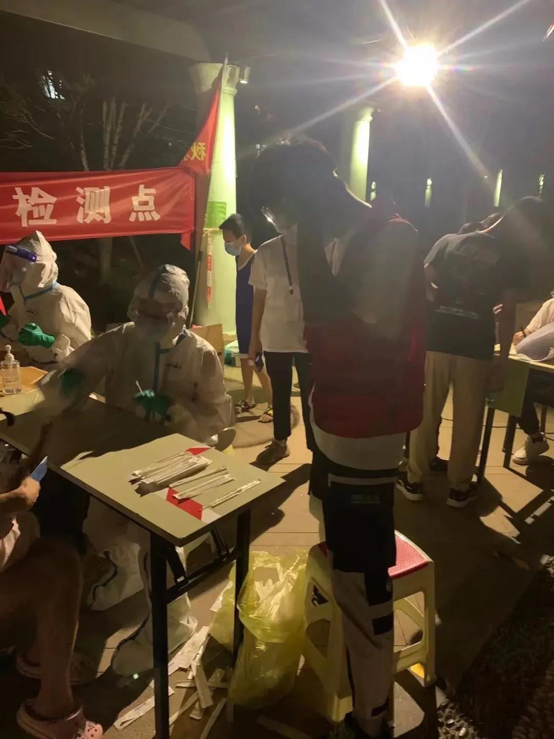 旅游外语学院20级国际邮轮2班杨子慧所在的社区在31号接收到消息开始,就挨家挨户排查走访调查,直至8月1号凌晨三点才结束。8月1日早上6点,杨子慧到社区报到,然后就开始做安排社区居民进行核酸检测的准备工作,直到中午一点准备完毕,才开始让居民下楼排队,准备检测。由于医务人员少,工作量大,志愿者们便分工合作,负责管理队伍,分发矿泉水,量体温等工作,减轻医务人员的工作压力。杨子慧负责量体温,以及帮助医务人员拆棉签。从早上6点到次日凌晨1点,核酸检测工作才全部结束。