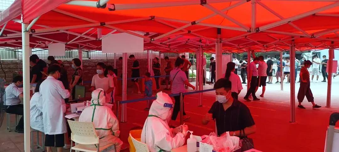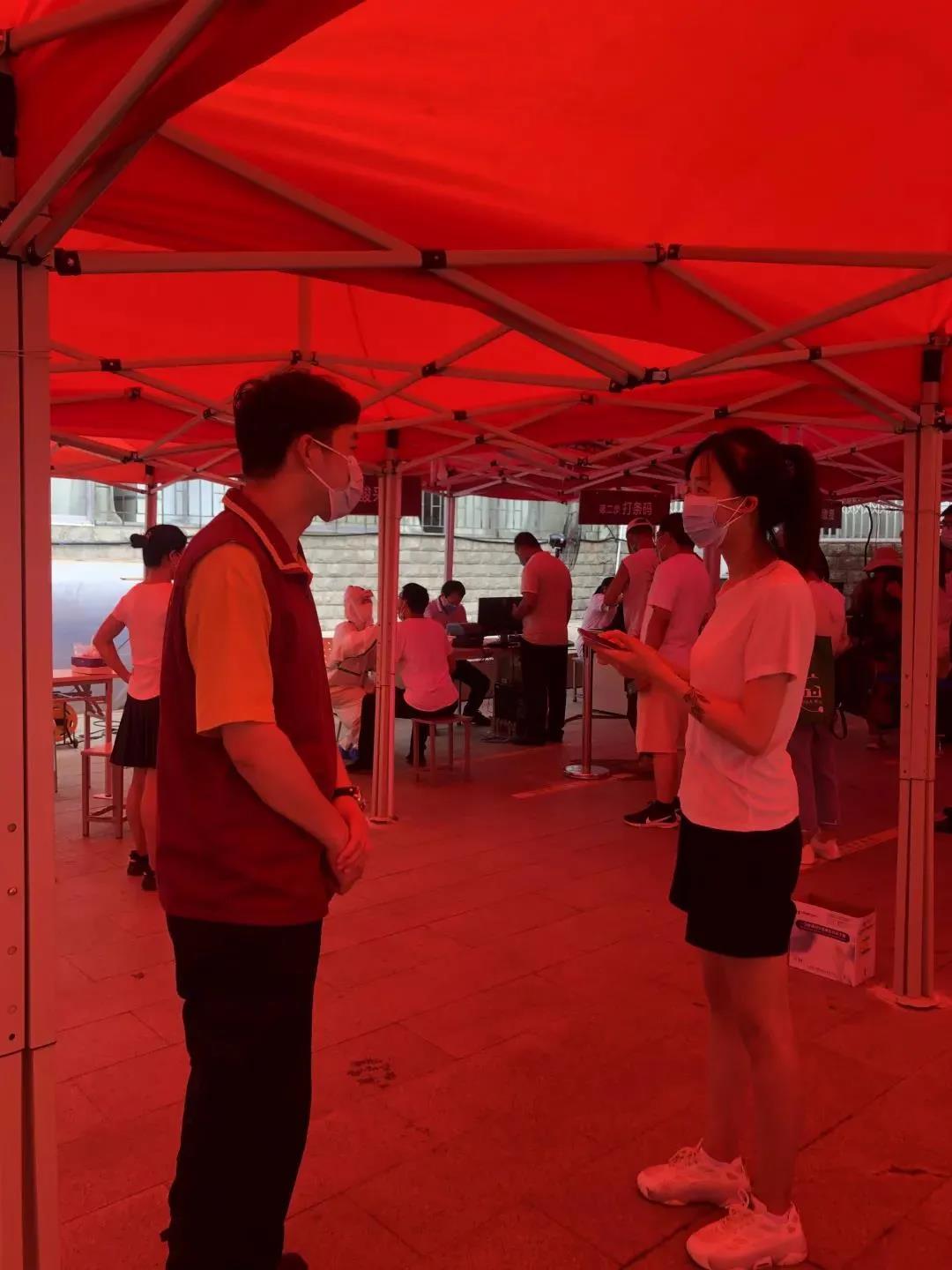 8月1日早上6点齐赛到达门诊楼配合医护人员进行人员分流,上午9点在医护人员和其他志愿者的合作下二十张红帐篷的成功搭建,让已经从诊室排到路边的大家少了一些炎热的焦灼。由于医护人员有限,群众对检测流程较为陌生,齐赛与其他工作人员分工合作,领着大家到达检测点、发热点,帮助行动不便的民众推轮椅、挂号、取结果、消毒、提供一切帮助、疏导院内交通安全,每日检测万余人次。