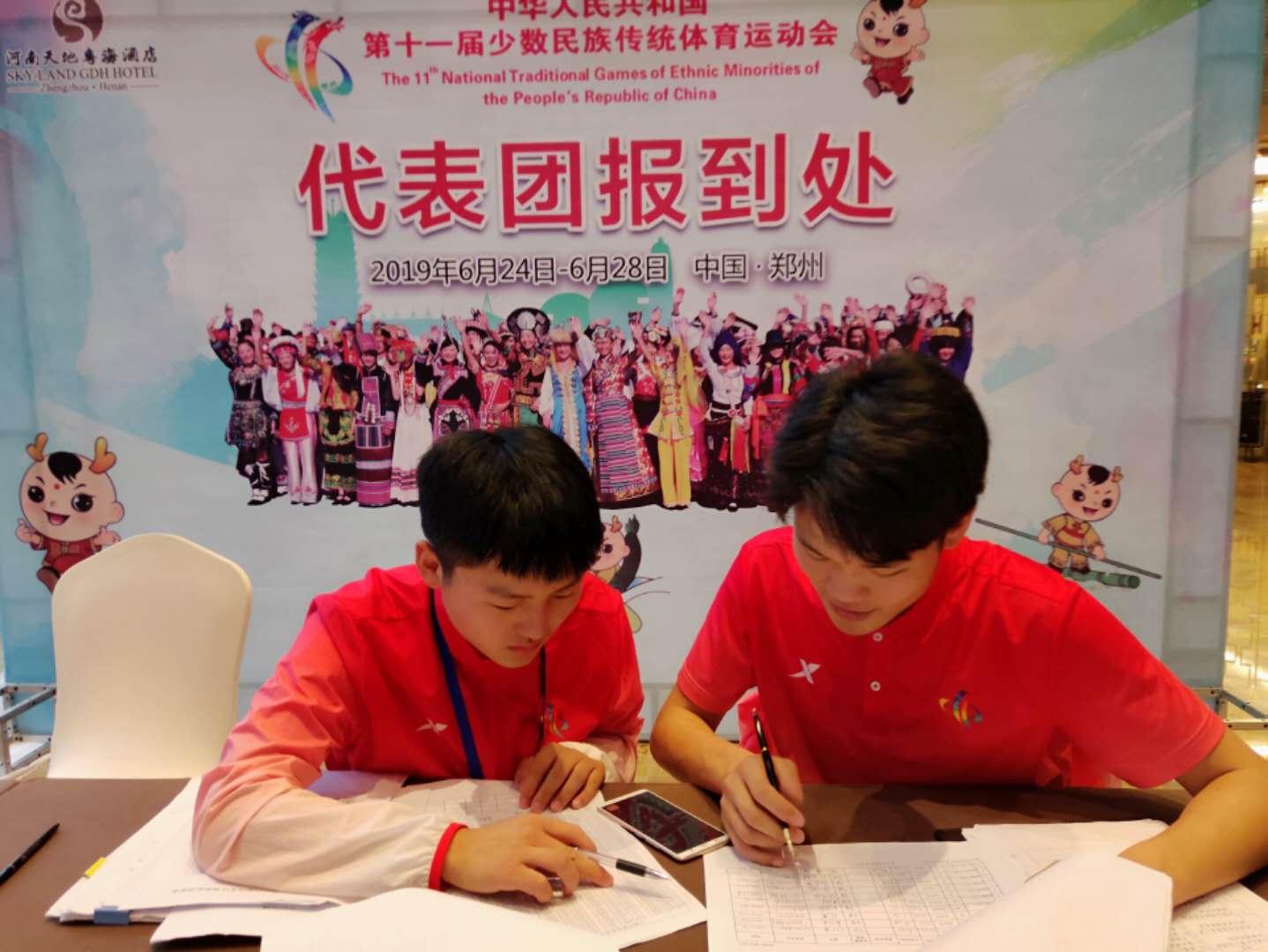 志愿者登记核实参赛选手入住情况,统计核对餐票发放