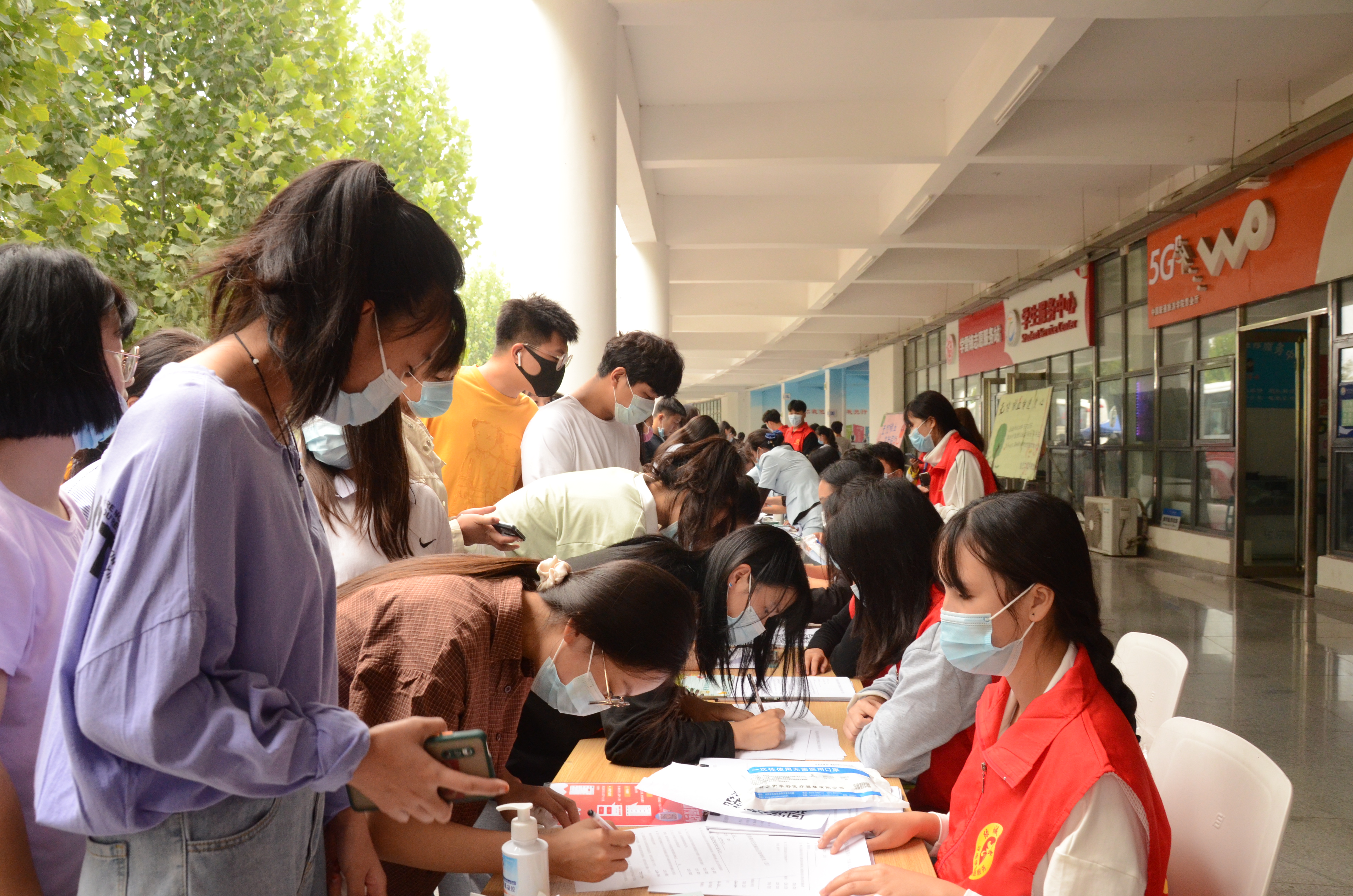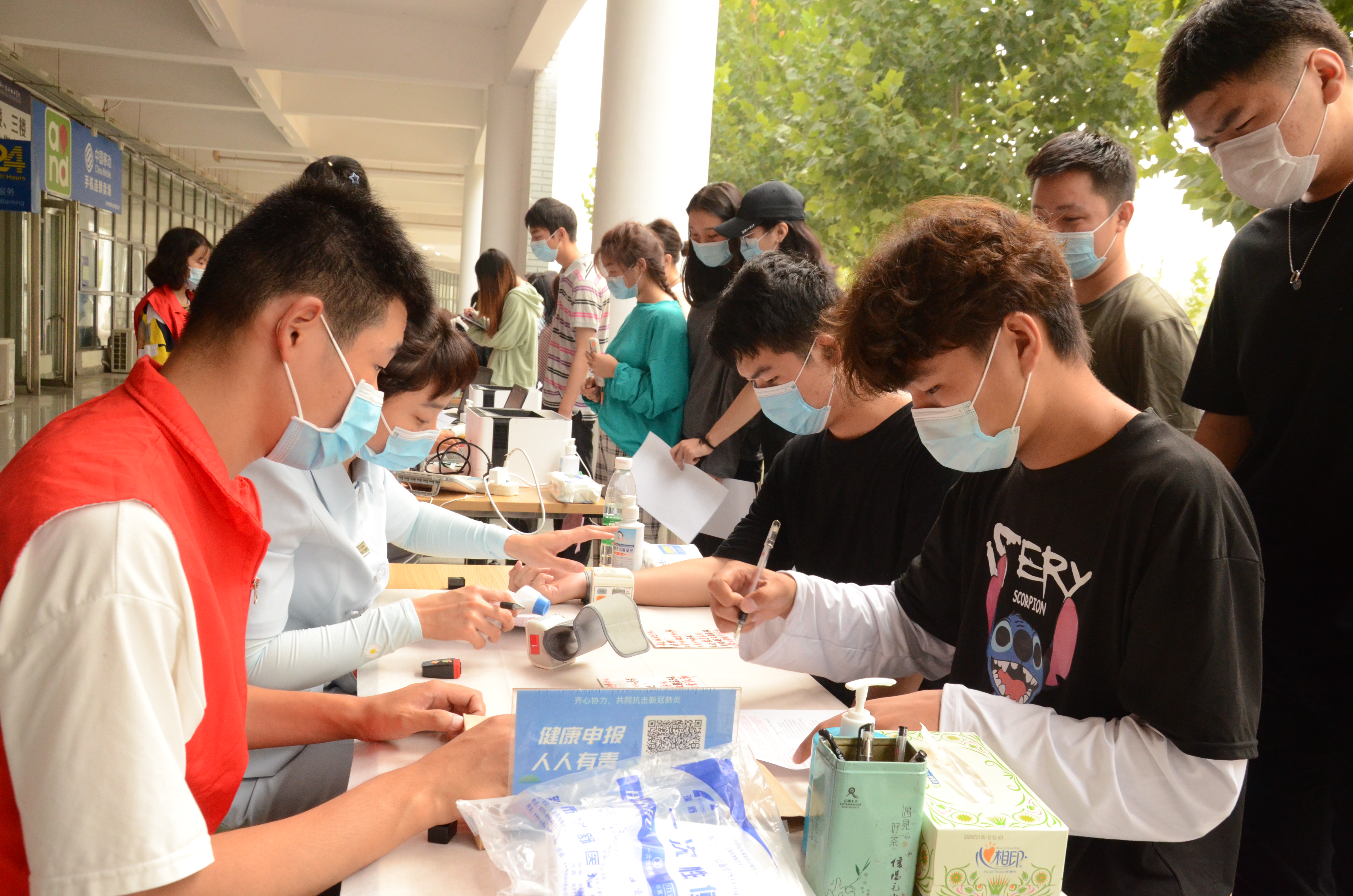秋分后的早晨有些微凉,同学们早早到达,在志愿者的引领下有序填表登记,测量血压、化验血型、排队等候献血。现场服务的志愿者们认真的在自己岗位上工作,保障献血活动安全有序进行。