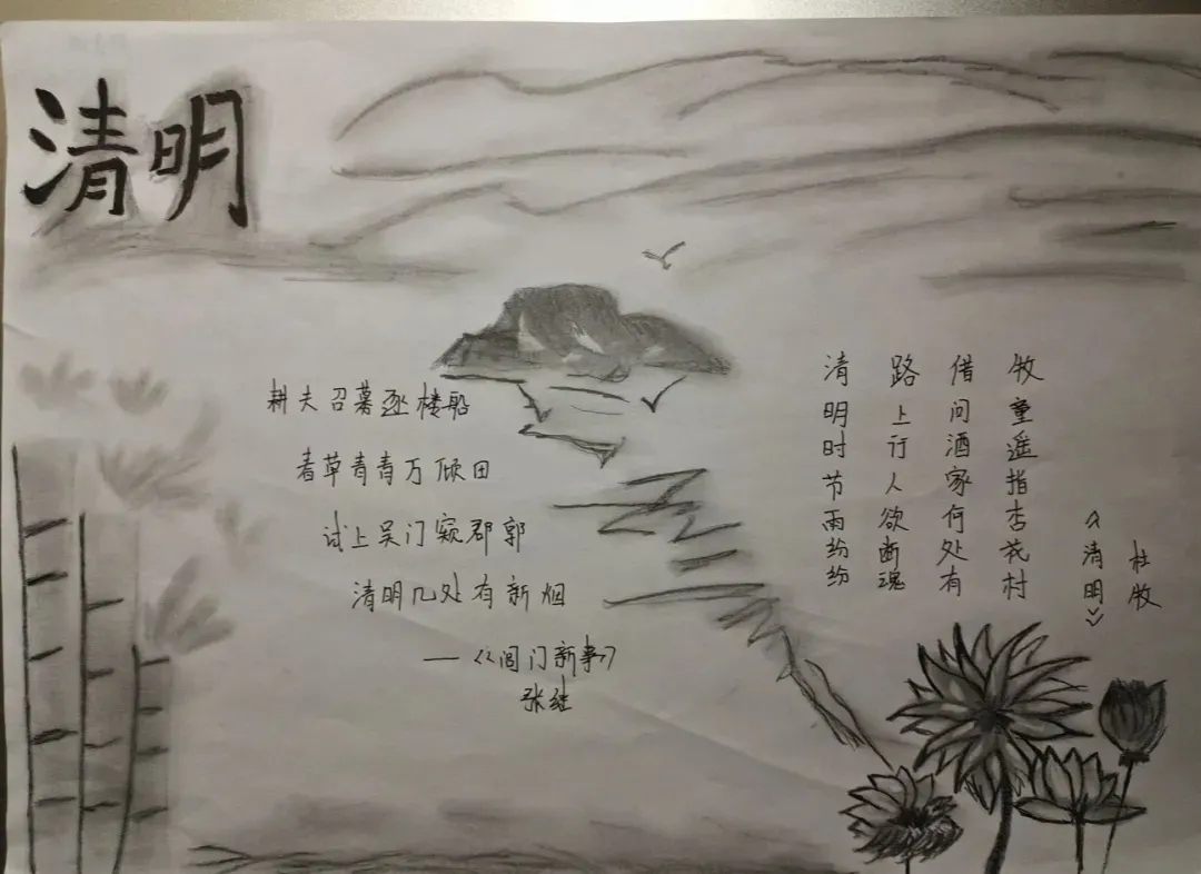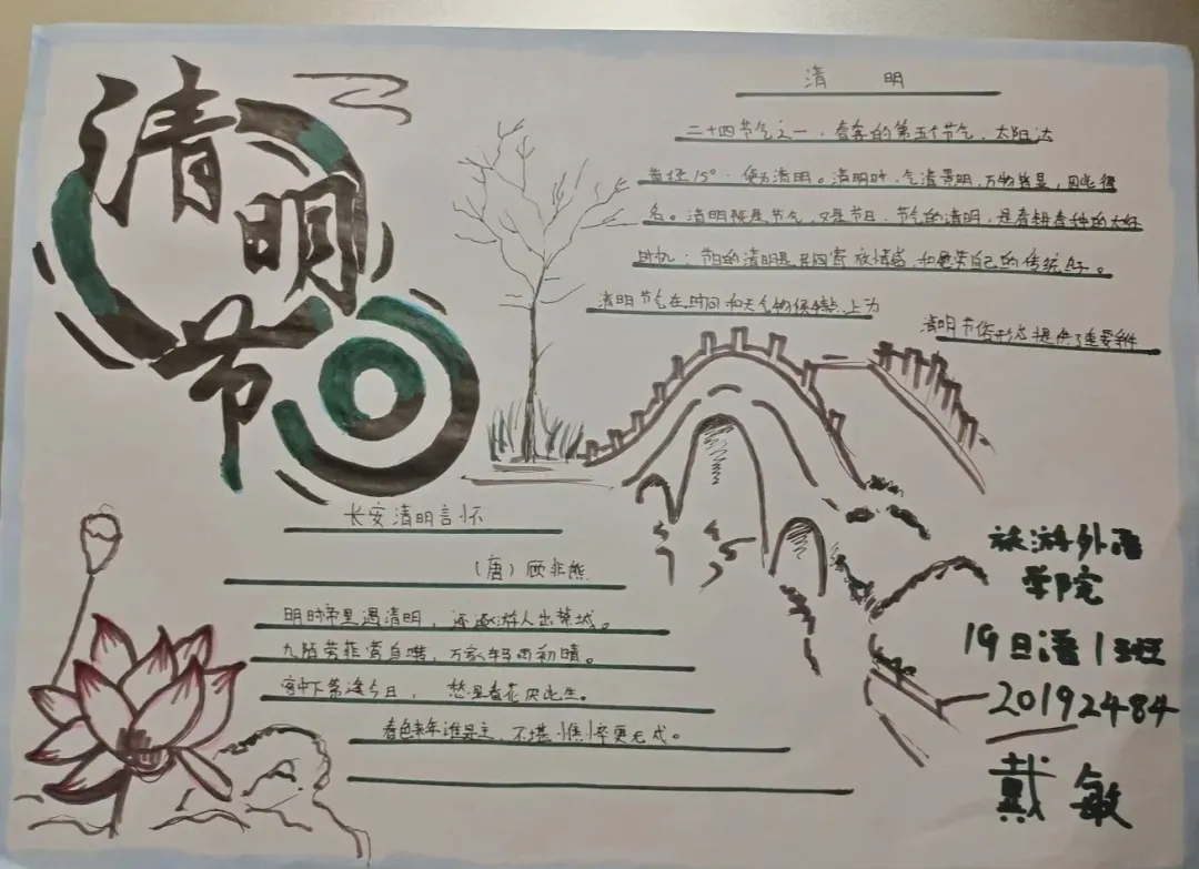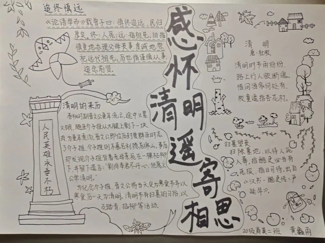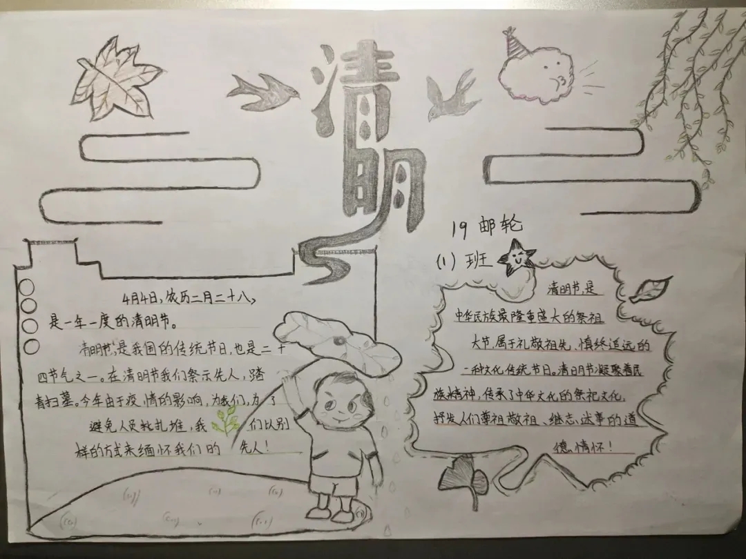 同学们积极踊跃的参加此次活动,有的同学通过录制拍摄视频,以视频的形式讲解清明节的由来,习俗。还有同学以手绘手抄报,以文字的形式来向烈士致敬!也有同学投稿参与,用语言文字弘扬爱国精神和对烈士的敬意。