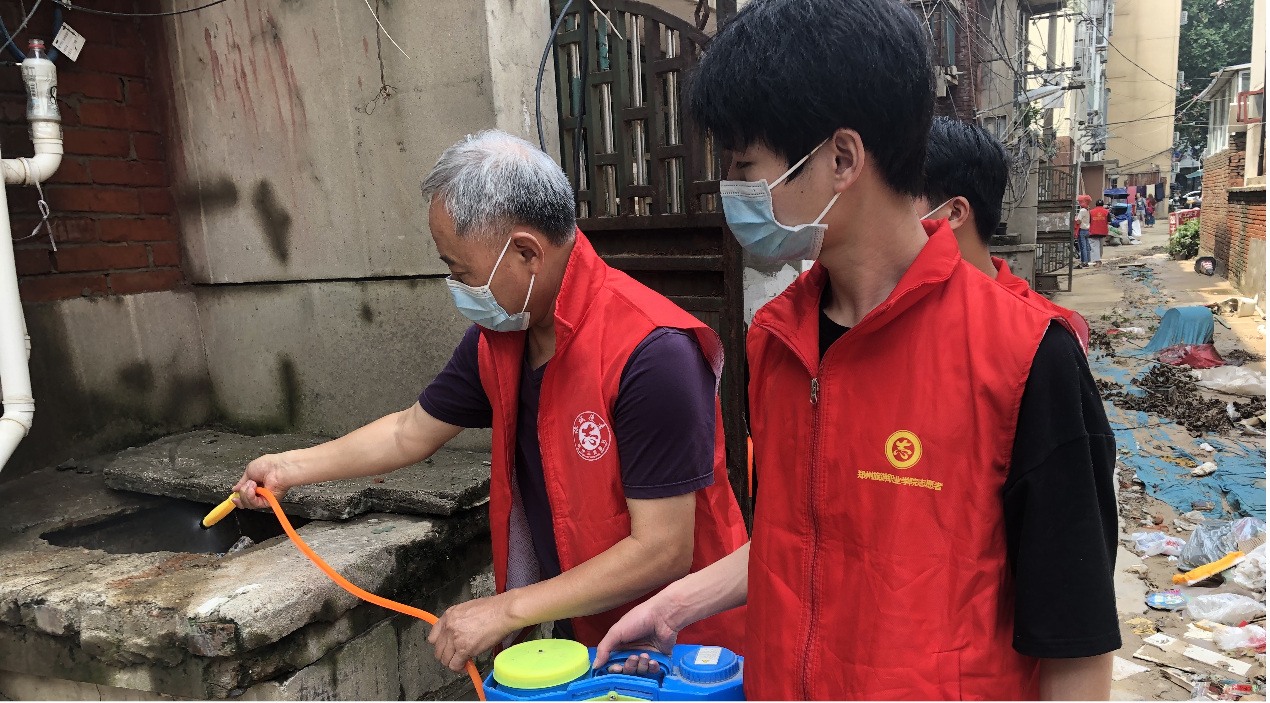 队员们分工明确、团结协作,铲水、消毒、搬运物资,抢险工作紧张而有序地进行着。一会儿功夫,突击队员们个个汗流浃背,但大家没有一个叫苦、没有一个退缩,个个精神抖擞,干劲冲天。充分展现当代青年学子不怕苦、不怕累、不怕脏的担当精神和“奉献、友爱、互助、进步”的志愿精神。