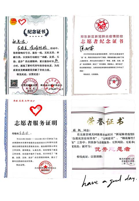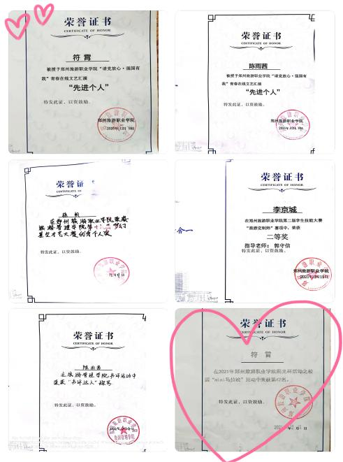 支部团员陈雨茜2020年参加新生迎新会表演节目,获得荣誉证书;2021年获得“三好学生”;参加“请党放心,强国有我”青春在线文艺汇演获得“先进个人”;参加“中华经典诵读”获得三等奖;2022年获得“三好学生”参加志愿者活动获得“志愿者纪念证书”;参加书评活动获得“书评达人”称号;参加“青春向党,百年党史”知识竞赛获得一等奖;参加“中国经典诵读”获得三等奖。