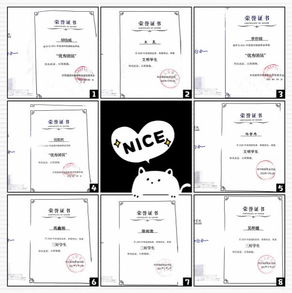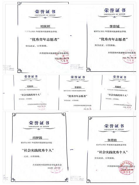 支部团员李京城2019年荣获校级“三好学生”“优秀团员”;2021年度被评为“郑州市三好学生”,校级“优秀团员”“优秀青年志愿者”;2022年参与河南省“挑战杯”荣获河南省铜奖,参加“青春向党,百年团史”荣获二等奖。支部团员吴冰燕2019年荣获“优秀团员”“三好学生” ;2020年荣获“三好学生”;2021年荣获“三好学生”“社会实践优秀个人”“优秀团员”“优秀青年志愿者”2022年参加“青春向党,百年团史”荣获二等奖。支部团员高鑫阳2021年荣获校级“三好学生”2022年荣获“优秀志愿者”“优秀社会实践个人”。